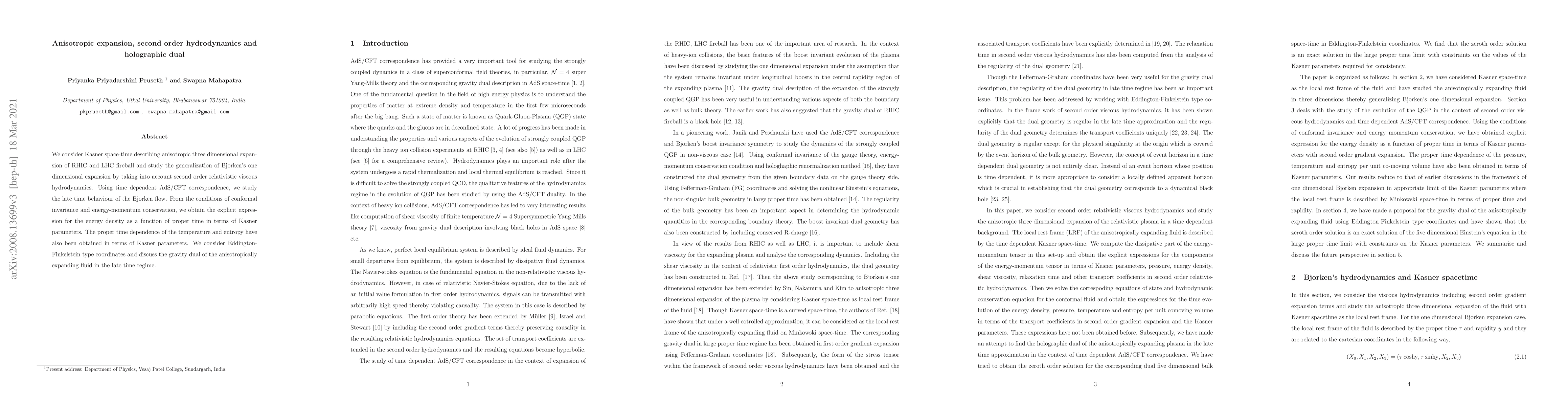 We consider Kasner space-time describing anisotropic three dimensional expansion of RHIC and LHC fireball and study the generalization of Bjorken's one dimensional expansion by taking into account second order relativistic viscous hydrodynamics. Using time dependent AdS/CFT correspondence, we study the late time behaviour of the Bjorken flow. From the conditions of conformal invariance and energy-momentum conservation, we obtain the explicit expression for the energy density as a function of proper time in terms of Kasner parameters. The proper time dependence of the temperature and entropy have also been obtained in terms of Kasner parameters. We consider Eddington-Finkelstein type coordinates and discuss the gravity dual of the anisotropically expanding fluid in the late time regime.
