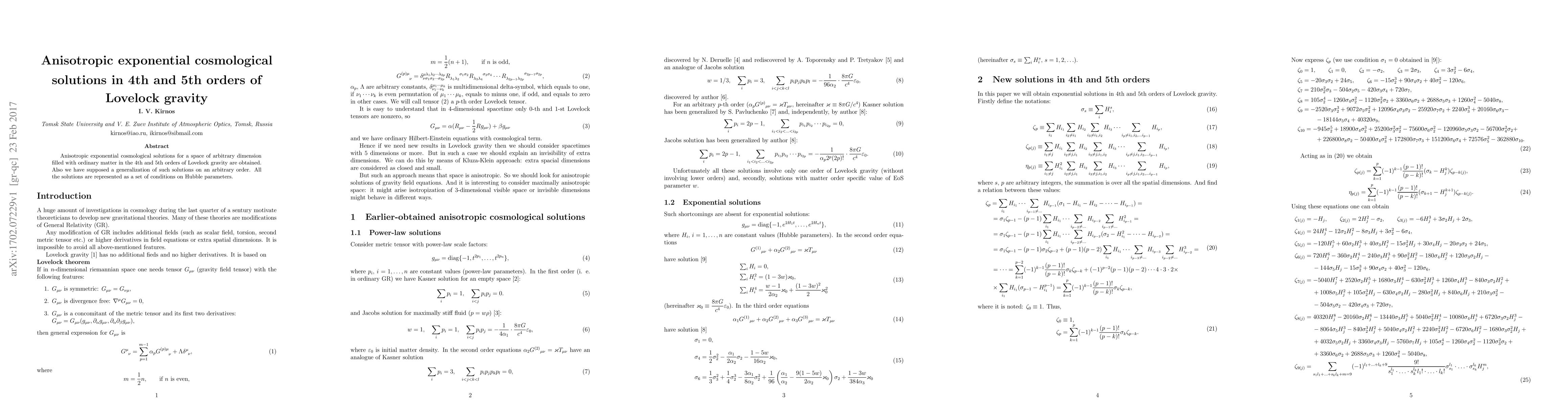 This paper presents anisotropic exponential cosmological solutions in 4th and 5th orders of Lovelock gravity for spaces of any dimension, filled with ordinary matter, and generalizes these solutions to any order. The solutions are expressed as conditions on the Hubble parameters.
