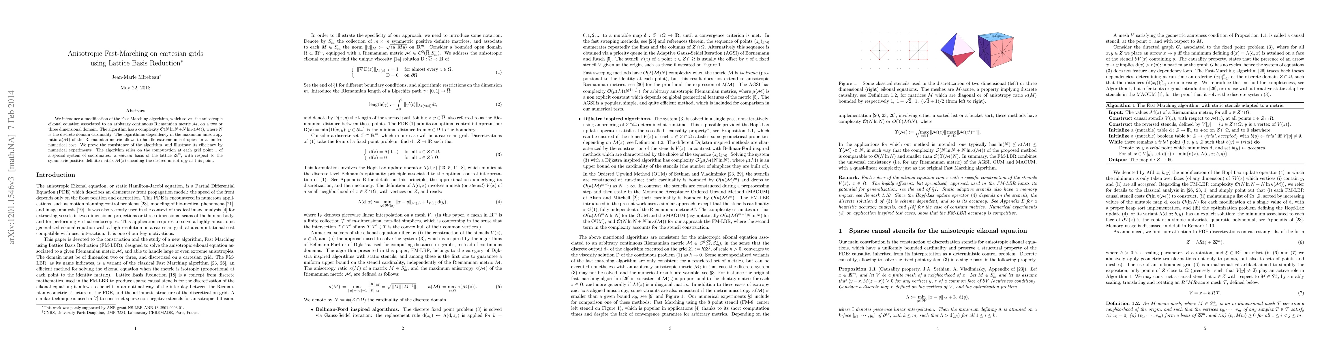 We introduce a modification of the Fast Marching Algorithm, which solves the generalized eikonal equation associated to an arbitrary continuous riemannian metric, on a two or three dimensional domain. The algorithm has a logarithmic complexity in the maximum anisotropy ratio of the riemannian metric, which allows to handle extreme anisotropies for a reduced numerical cost. We prove the consistence of the algorithm, and illustrate its efficiency by numerical experiments. The algorithm relies on the computation at each grid point of a special system of coordinates: a reduced basis of the cartesian grid, with respect to the symmetric positive definite matrix encoding the desired anisotropy at this point.