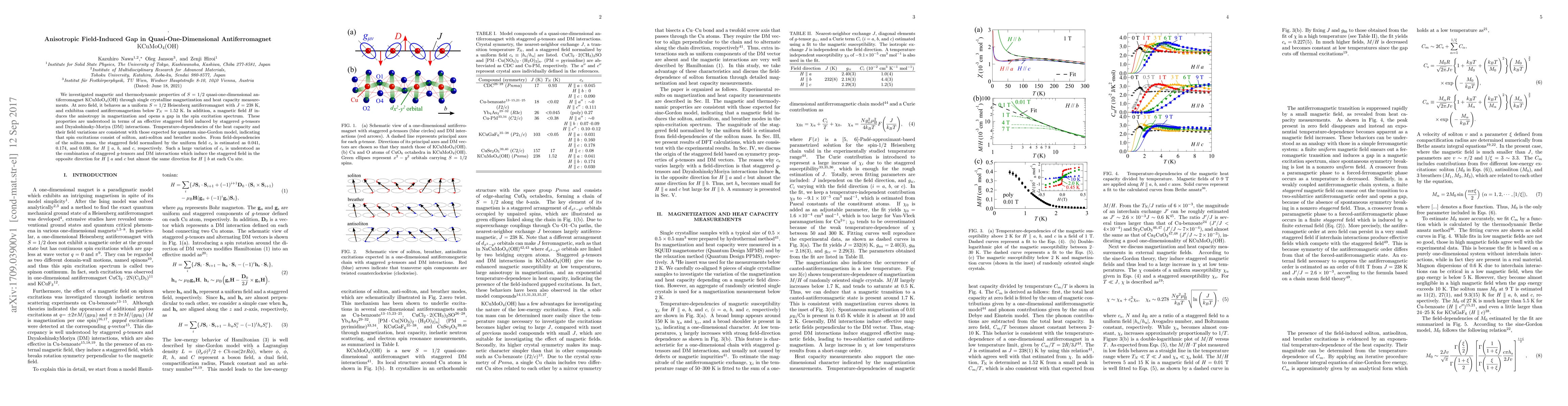 The research examines KCuMoO$_4$(OH), a quasi-one-dimensional antiferromagnet. It reveals the material's magnetic and thermodynamic properties, showing anisotropic field-induced gap due to staggered g-tensors and Dzyaloshinsky-Moriya interactions. The findings align with quantum sine-Gordon model predictions, identifying soliton, anti-soliton, and breather modes in spin excitations.