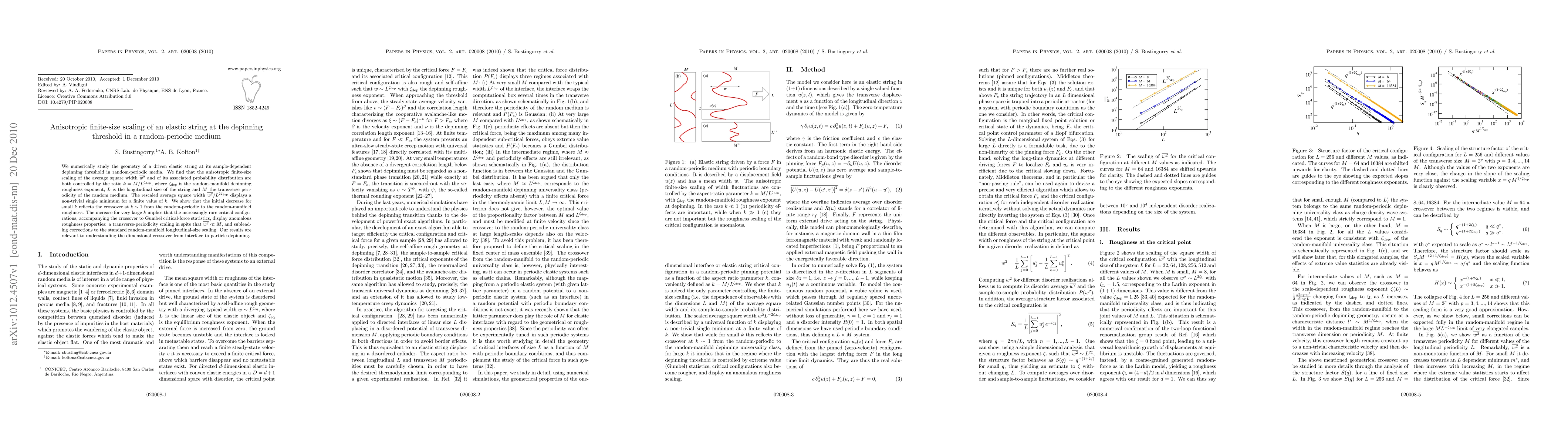 We numerically study the geometry of a driven elastic string at its sample-dependent depinning threshold in random-periodic media. We find that the anisotropic finite-size scaling of the average square width $\bar{w^2}$ and of its associated probability distribution are both controlled by the ratio $k=M/L^{\zeta_{\mathrm{dep}}}$, where $\zeta_{\mathrm{dep}}$ is the random-manifold depinning roughness exponent, $L$ is the longitudinal size of the string and $M$ the transverse periodicity of the random medium. The rescaled average square width $\bar{w^2}/L^{2\zeta_{\mathrm{dep}}}$ displays a non-trivial single minimum for a finite value of $k$. We show that the initial decrease for small $k$ reflects the crossover at $k \sim 1$ from the random-periodic to the random-manifold roughness. The increase for very large $k$ implies that the increasingly rare critical configurations, accompanying the crossover to Gumbel critical-force statistics, display anomalous roughness properties: a transverse-periodicity scaling in spite that $\bar{w^2} \ll M$, and subleading corrections to the standard random-manifold longitudinal-size scaling. Our results are relevant to understanding the dimensional crossover from interface to particle depinning.