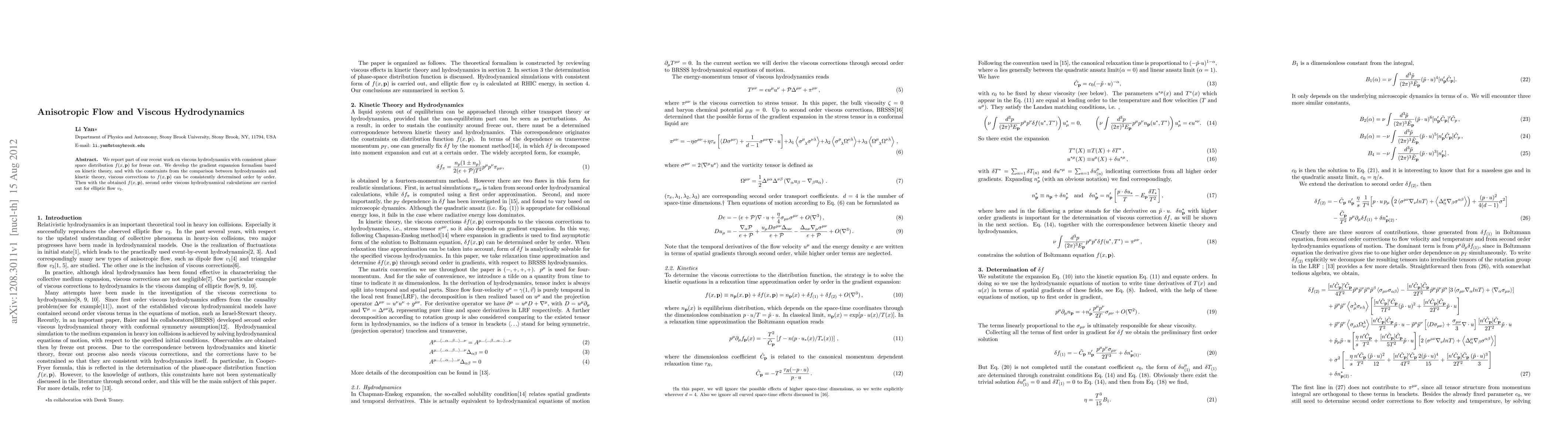 This paper develops a gradient expansion formalism for viscous hydrodynamics based on kinetic theory, enabling consistent determination of viscous corrections to the phase space distribution function. Second-order viscous hydrodynamic calculations for elliptic flow $v_2$ are performed using the refined distribution function.