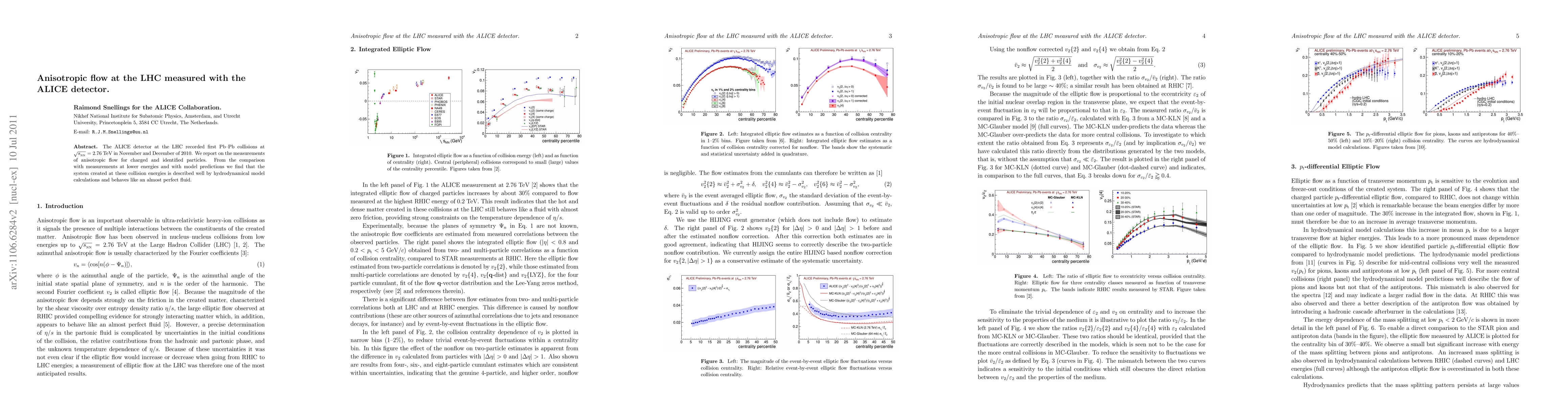 The ALICE detector at the LHC measured anisotropic flow in Pb-Pb collisions at 2.76 TeV, revealing that the system behaves like an almost perfect fluid, consistent with hydrodynamical model predictions. These findings suggest a strong collective behavior in the high-energy nuclear matter created.