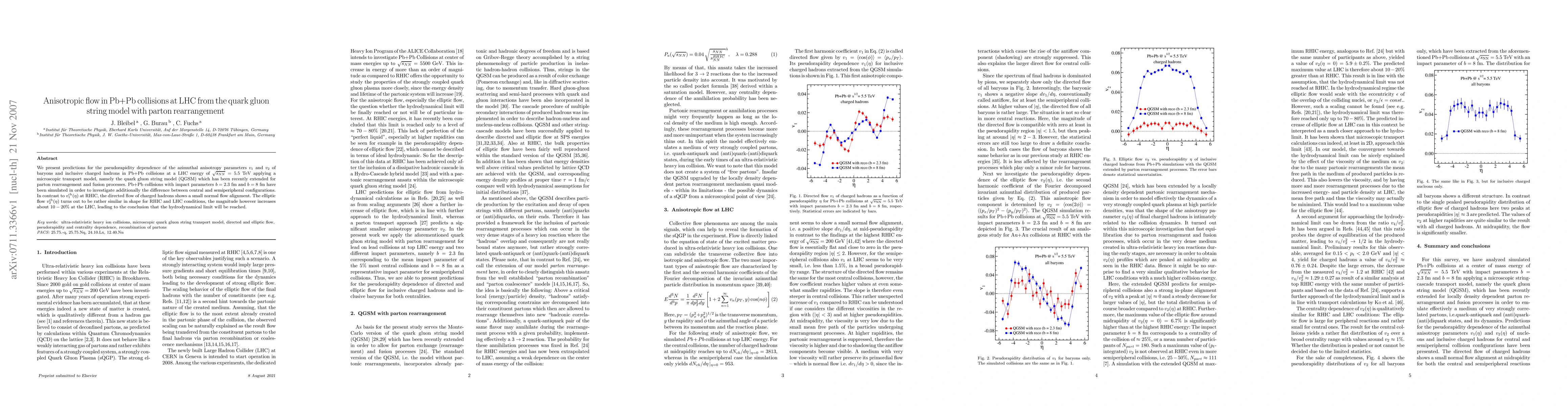 We present predictions for the pseudorapidity dependence of the azimuthal anisotropy parameters v_1 and v_2 of baryons and inclusive charged hadrons in Pb+Pb collisions at a LHC energy of sqrt(s) = 5.5 TeV applying a microscopic transport model, namely the quark gluon string model (QGSM) which has been recently extended for parton rearrangement and fusion processes. Pb+Pb collisions with impact parameters b = 2.3 fm and b = 8 fm have been simulated in order to investigate additionally the difference between central and semiperipheral configurations. In contrast to v_1(eta) at RHIC, the directed flow of charged hadrons shows a small normal flow alignment. The elliptic flow v_2(eta) turns out to be rather similar in shape for RHIC and LHC conditions, the magnitude however increases about 10-20 % at the LHC, leading to the conclusion that the hydrodynamical limit will be reached.