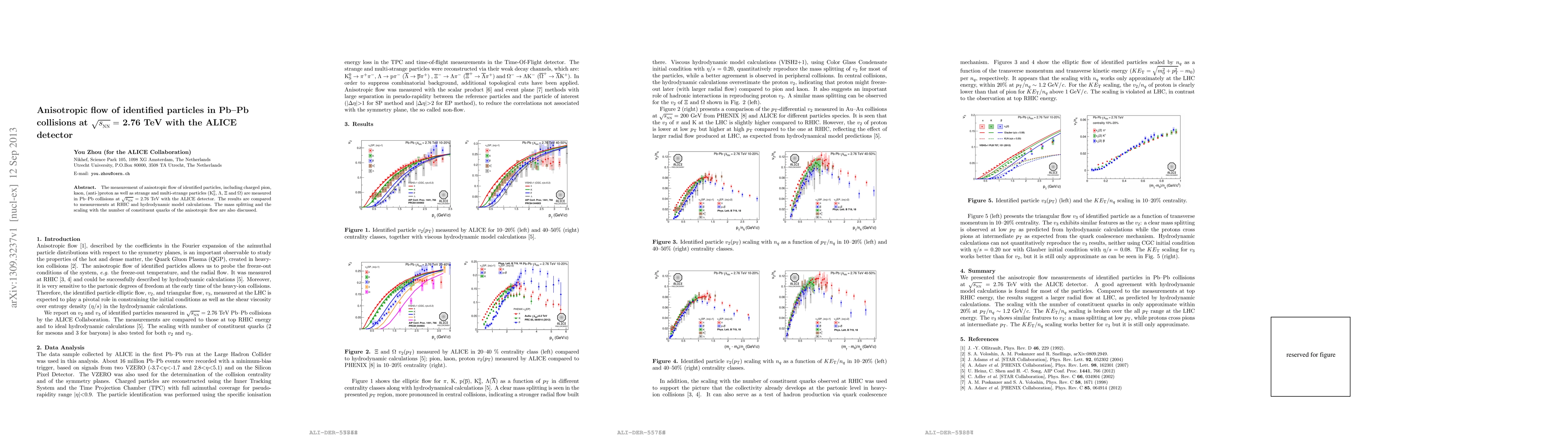 This paper measures anisotropic flow of identified particles in Pb-Pb collisions at 2.76 TeV using the ALICE detector, comparing results to RHIC data and hydrodynamic models. It also discusses mass splitting and scaling with the number of constituent quarks.
