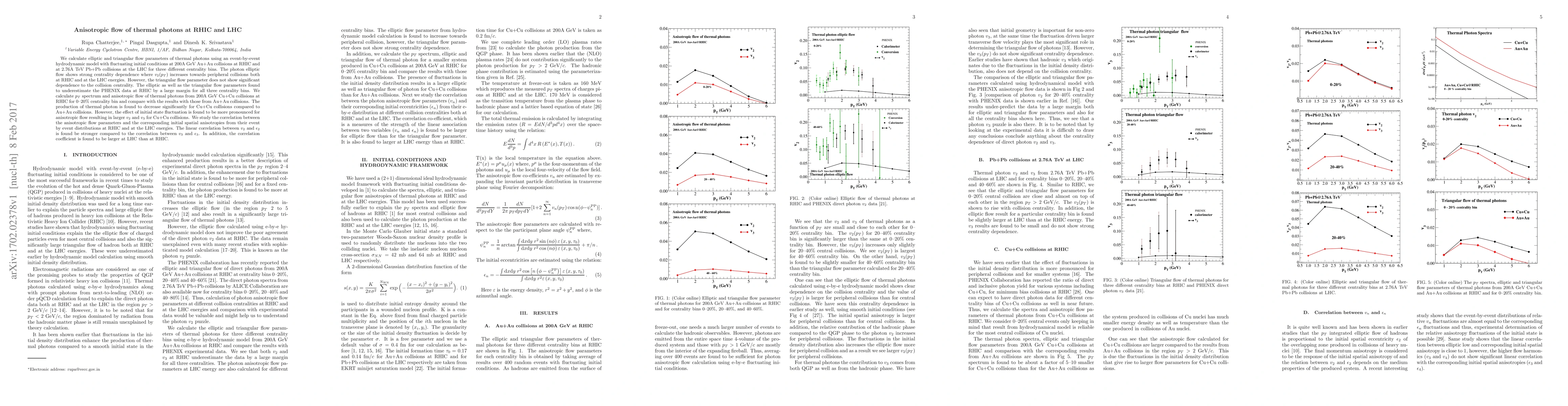 This paper investigates the anisotropic flow of thermal photons in heavy-ion collisions at RHIC and LHC, finding strong centrality dependence in elliptic flow but not in triangular flow. The calculated flow parameters significantly underestimate PHENIX data at RHIC, while thermal photon production decreases in Cu+Cu collisions compared to Au+Au collisions, though initial state fluctuations enhance anisotropic flow in Cu+Cu.
