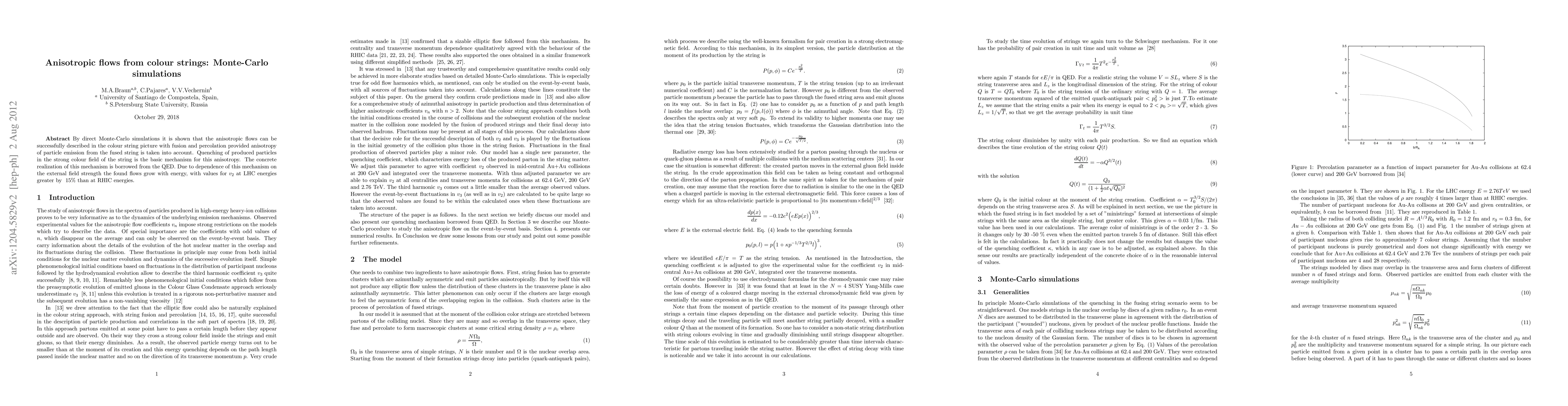 By direct Monte-Carlo simulations it is shown that the anisotropic flows can be successfully described in the colour string picture with fusion and percolation provided anisotropy of particle emission from the fused string is taken into account. Quenching of produced particles in the strong colour field of the string is the basic mechanism for this anisotropy. The concrete realization of this mechanism is borrowed from the QED. Due to dependence of this mechanism on the external field strength the found flows grow with energy, with values for $v_2$ at LHC energies greater by ~15% than at RHIC energies.