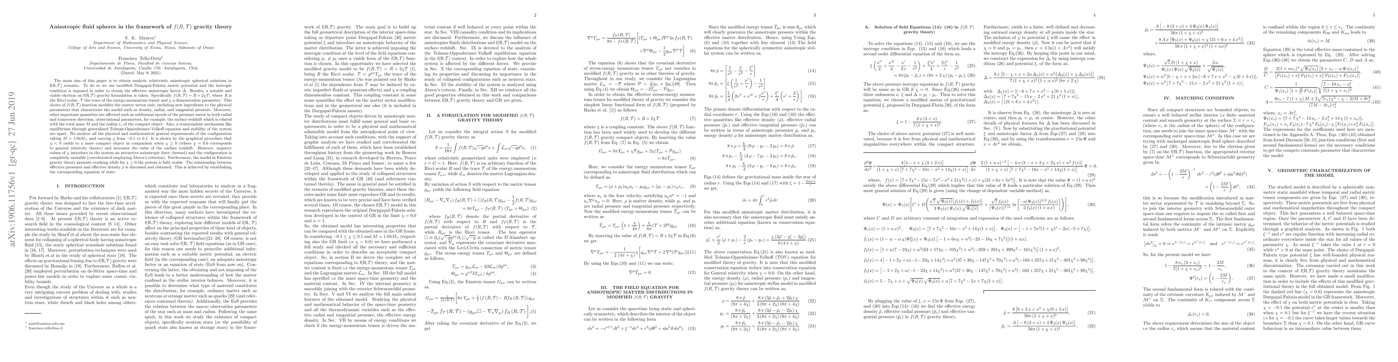 This paper explores relativistic anisotropic spherical solutions in a modified gravity theory called $f(R, ilde{ au})$, which includes a dimensionless parameter $ ilde{ au}$ that affects the properties of compact objects.