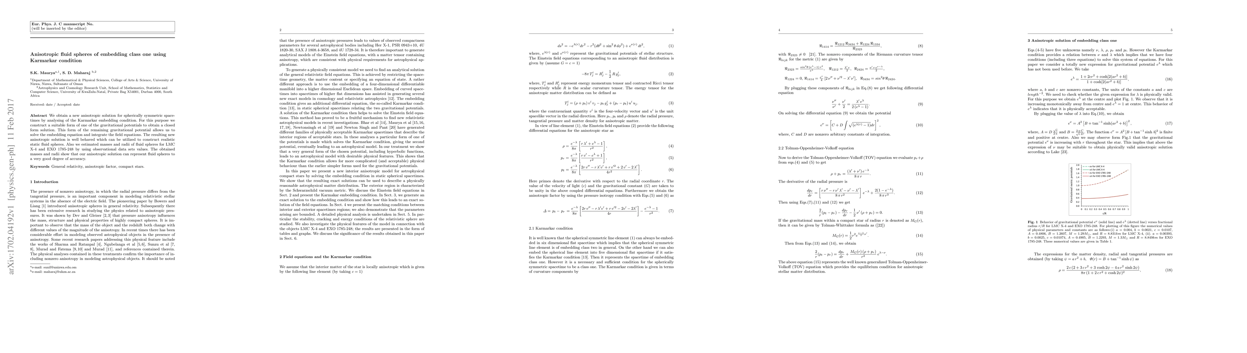 This paper presents a new anisotropic solution for spherically symmetric spacetimes derived using the Karmarkar embedding condition, which allows for realistic static fluid spheres. The solution's accuracy is demonstrated by estimating masses and radii for LMC X-4 and EXO 1785-248, showing good agreement with observational data.