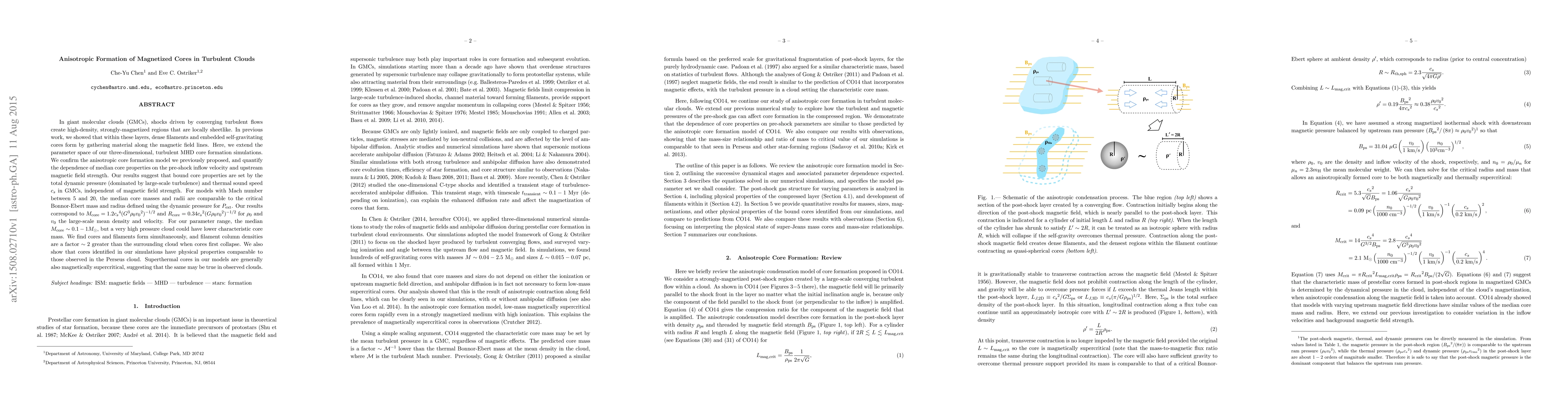 This paper extends simulations of anisotropic core formation in magnetized, turbulent giant molecular clouds, confirming that core properties are primarily determined by dynamic pressure and thermal sound speed, rather than magnetic field strength. The median core masses and radii align with critical Bonnor-Ebert mass and radius, suggesting a strong correlation between observed Perseus cloud cores and simulated cores.