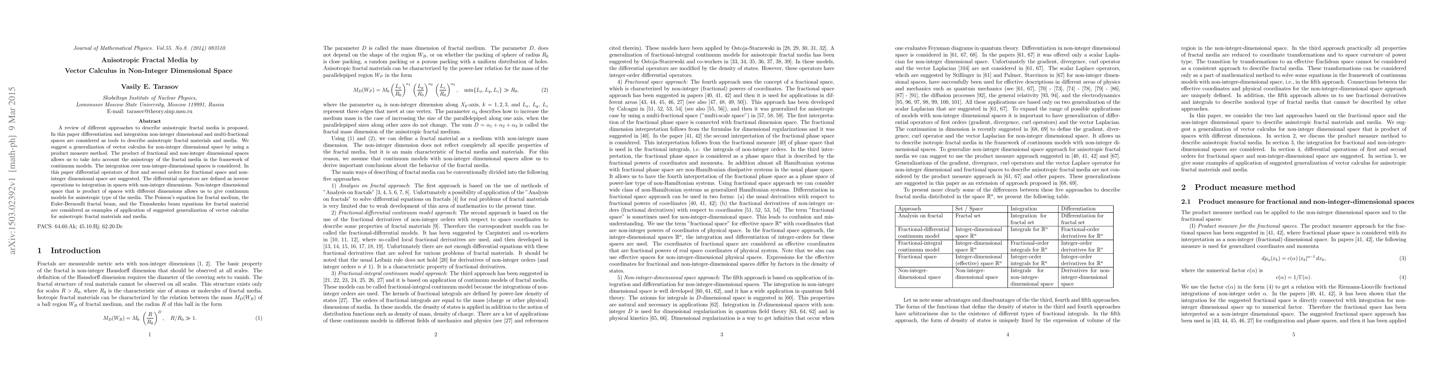 This paper reviews methods to describe anisotropic fractal media using vector calculus in non-integer dimensional space, proposing generalized differential operators and integration techniques. It applies these methods to continuum models for anisotropic fractal materials, including the Poisson's equation and beam equations.