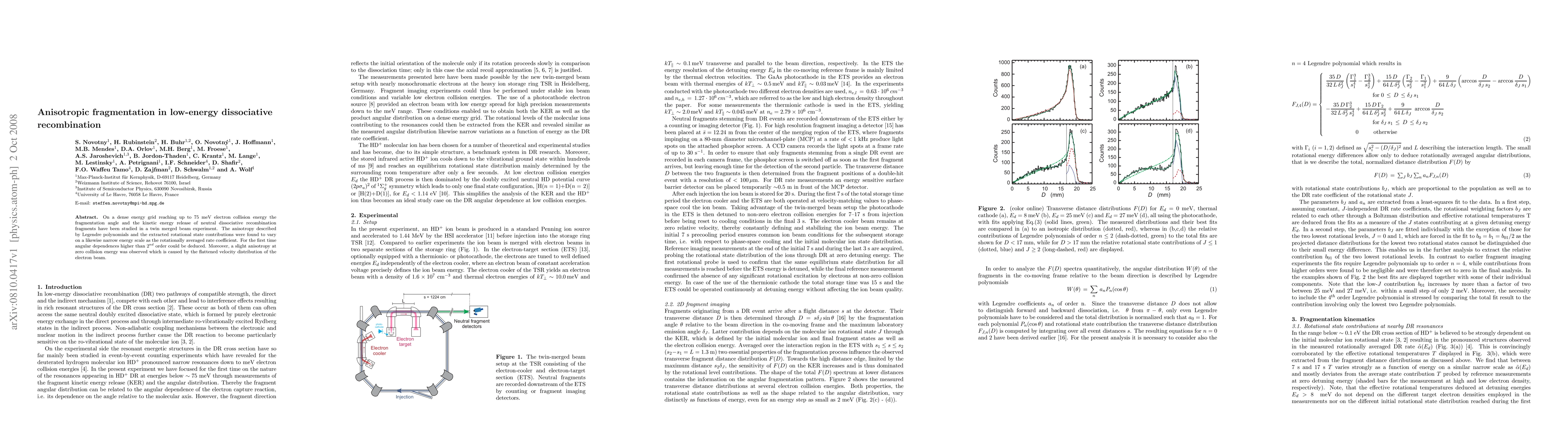 This study investigates anisotropic fragmentation in low-energy dissociative recombination using a twin merged beam experiment, revealing significant variations in anisotropy and rotational state contributions on a narrow energy scale. Notably, higher-order angular dependences were deduced for the first time, along with a slight anisotropy observed at zero collision energy due to the electron beam's flattened velocity distribution.