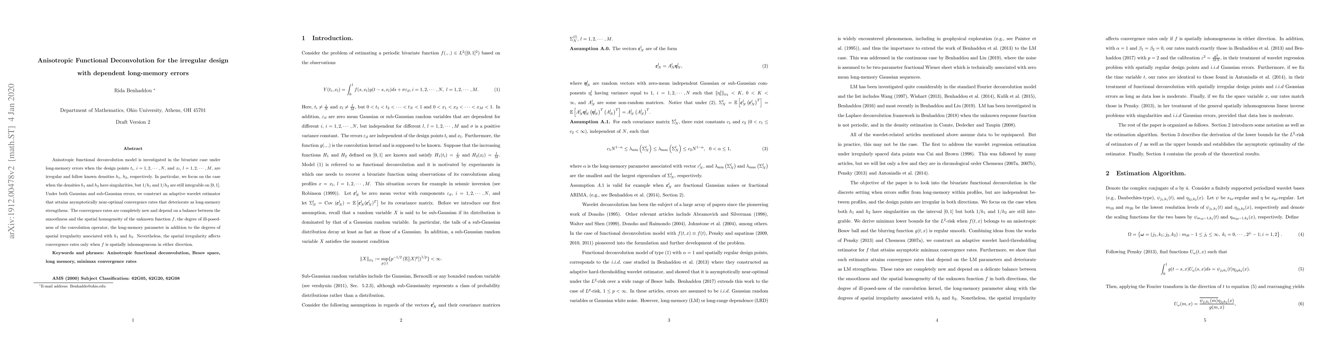 This paper develops an anisotropic functional deconvolution model for irregular bivariate design points with dependent long-memory errors, proposing an adaptive wavelet estimator that achieves near-optimal convergence rates under Gaussian and sub-Gaussian errors, with rates influenced by the function's smoothness, spatial homogeneity, and the degree of design irregularity.