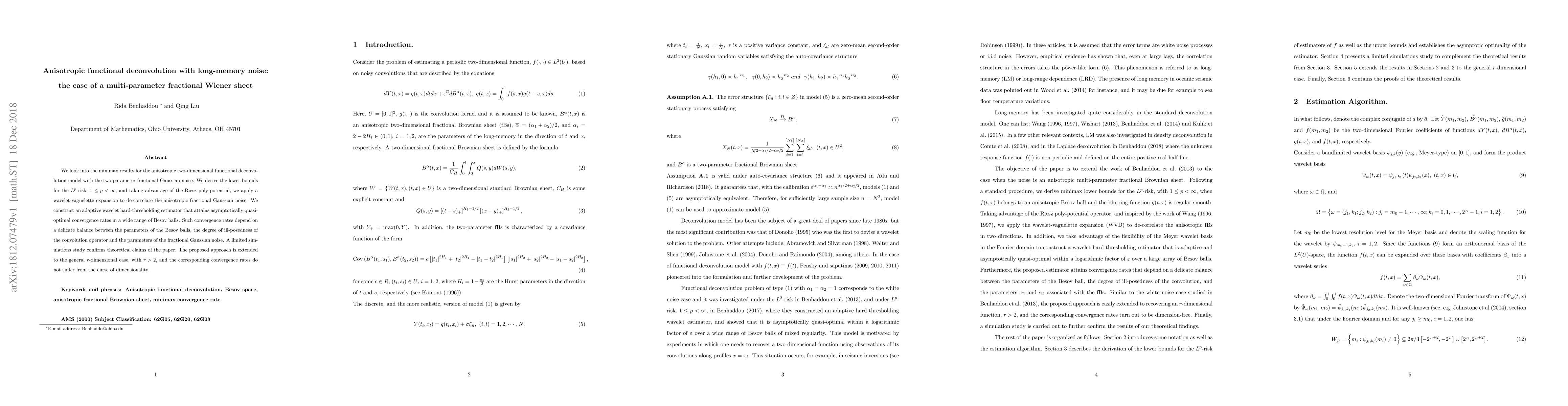This paper investigates minimax results for anisotropic functional deconvolution with long-memory noise, specifically two-parameter fractional Gaussian noise, and proposes an adaptive wavelet estimator achieving quasi-optimal convergence rates across various Besov spaces. The approach is validated through simulations and extended to higher dimensions without losing efficiency.
