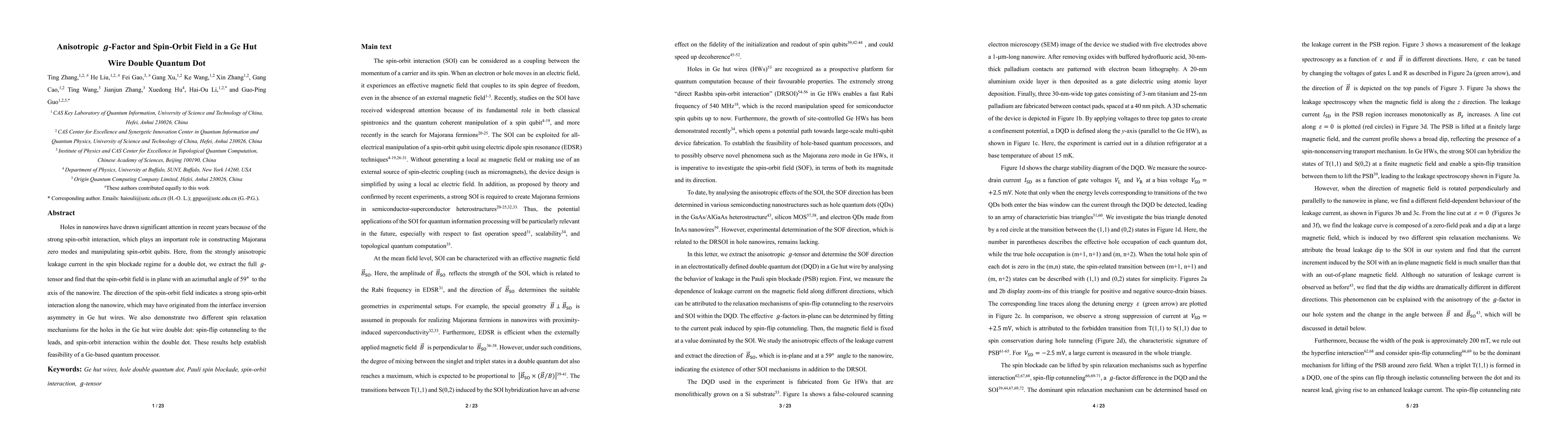 This study investigates the anisotropic g-factor and spin-orbit field in a germanium (Ge) hut wire double quantum dot, revealing a strong in-plane spin-orbit interaction due to interface inversion asymmetry. The research identifies two spin relaxation mechanisms and supports the potential for Ge-based quantum computing.