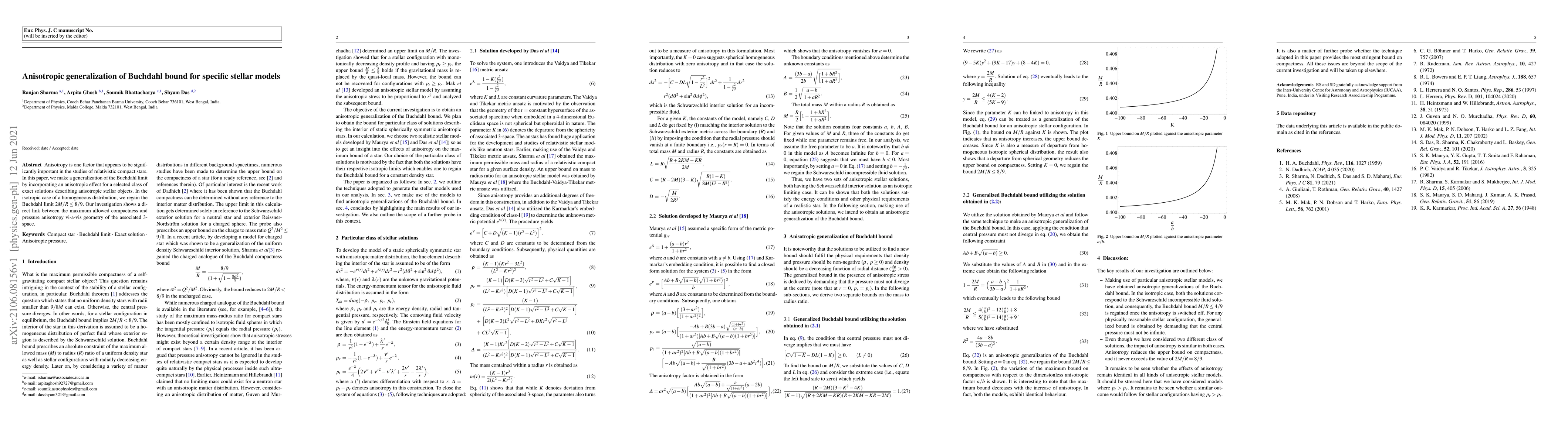 Anisotropy is one factor that appears to be significantly important in the studies of relativistic compact stars. In this paper, we make a generalization of the Buchdahl limit by incorporating an anisotropic effect for a selected class of exact solutions describing anisotropic stellar objects. In the isotropic case of a homogeneous distribution, we regain the Buchdahl limit $2M/R \leq 8/9$. Our investigation shows a direct link between the maximum allowed compactness and pressure anisotropy vi-a-vis geometry of the associated $3$-space.