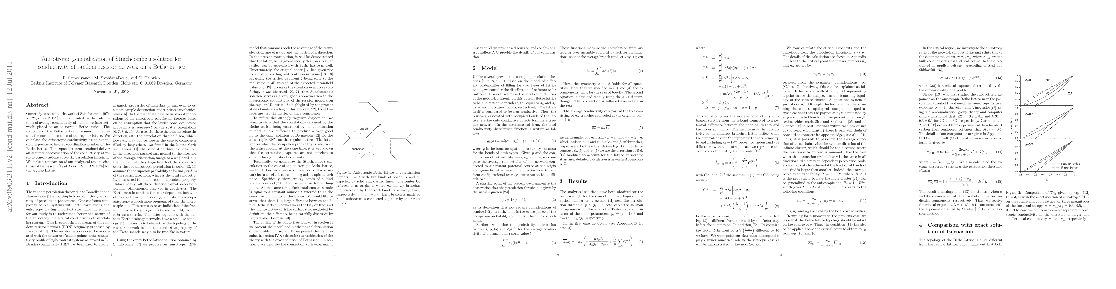 This paper generalizes Stinchcombe's solution to calculate the average conductivity of random resistor networks on an anisotropic Bethe lattice, providing an accurate approximation above the percolation threshold. The study compares these analytical results with Bernasconi's findings for regular lattices.