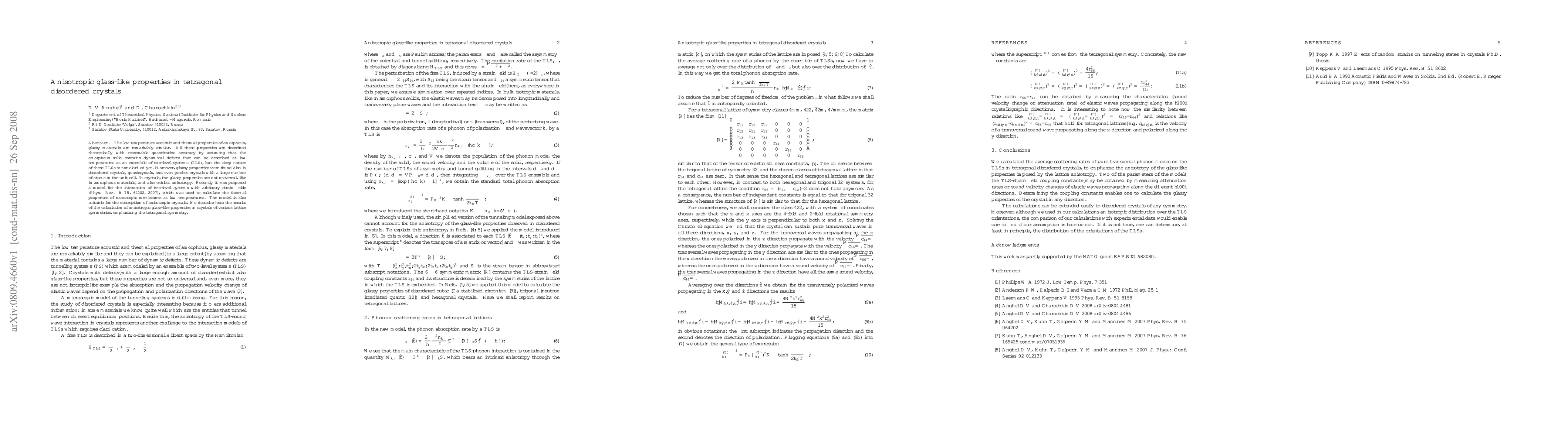 This paper investigates the anisotropic glass-like properties in tetragonal disordered crystals, proposing a model for two-level systems interacting with strain fields to describe thermal properties at low temperatures, and highlighting the unique anisotropic behavior in these crystals compared to amorphous materials.