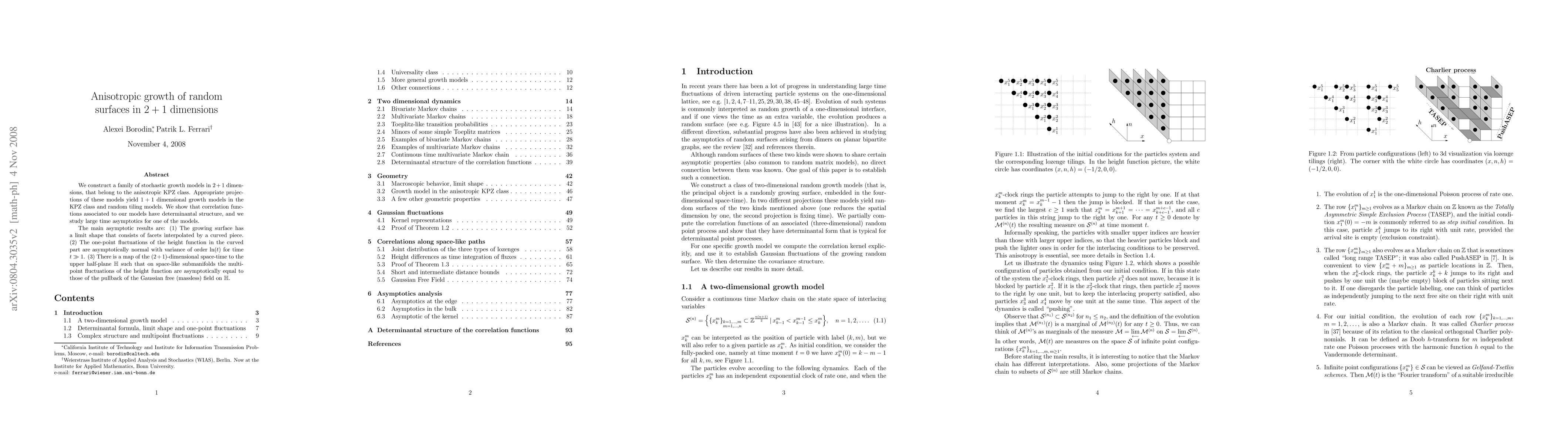 We construct a family of stochastic growth models in 2+1 dimensions, that belong to the anisotropic KPZ class. Appropriate projections of these models yield 1+1 dimensional growth models in the KPZ class and random tiling models. We show that correlation functions associated to our models have determinantal structure, and we study large time asymptotics for one of the models. The main asymptotic results are: (1) The growing surface has a limit shape that consists of facets interpolated by a curved piece. (2) The one-point fluctuations of the height function in the curved part are asymptotically normal with variance of order ln(t) for time t>>1. (3) There is a map of the (2+1)-dimensional space-time to the upper half-plane H such that on space-like submanifolds the multi-point fluctuations of the height function are asymptotically equal to those of the pullback of the Gaussian free (massless) field on H.