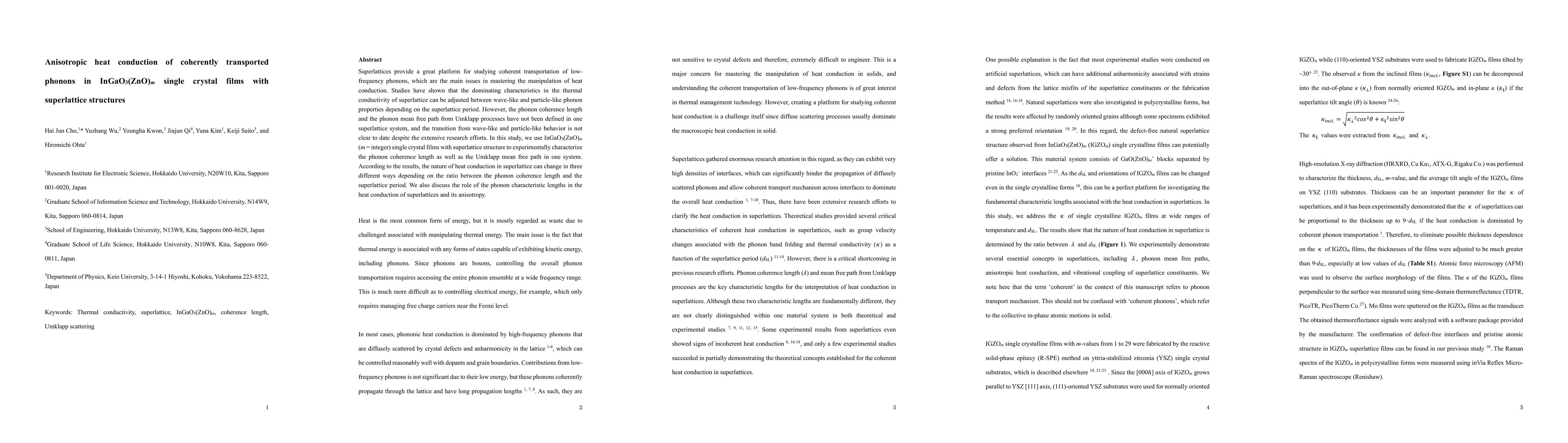 This study investigates the anisotropic heat conduction in InGaO3(ZnO)m single crystal films with superlattice structures, focusing on the coherent transportation of phonons. The research identifies three distinct modes of heat conduction based on the ratio of phonon coherence length to superlattice period, providing insights into the transition between wave-like and particle-like phonon behavior.