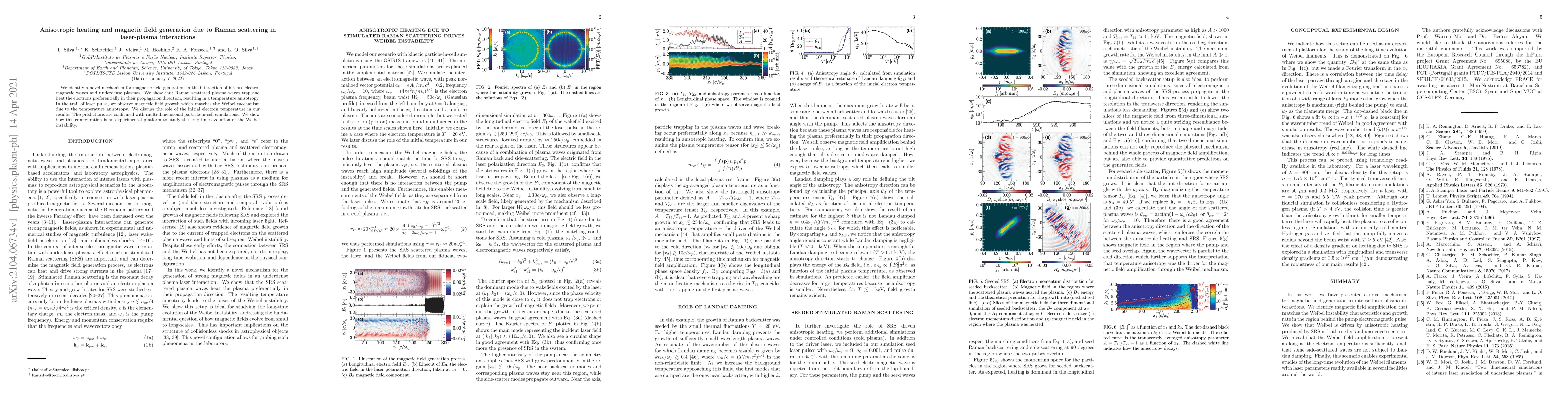 This paper identifies a mechanism for magnetic field generation in laser-plasma interactions, where Raman scattering creates anisotropic heating, leading to magnetic field growth akin to the Weibel mechanism. Multi-dimensional simulations confirm the findings and suggest this setup as a platform to study the Weibel instability's evolution.