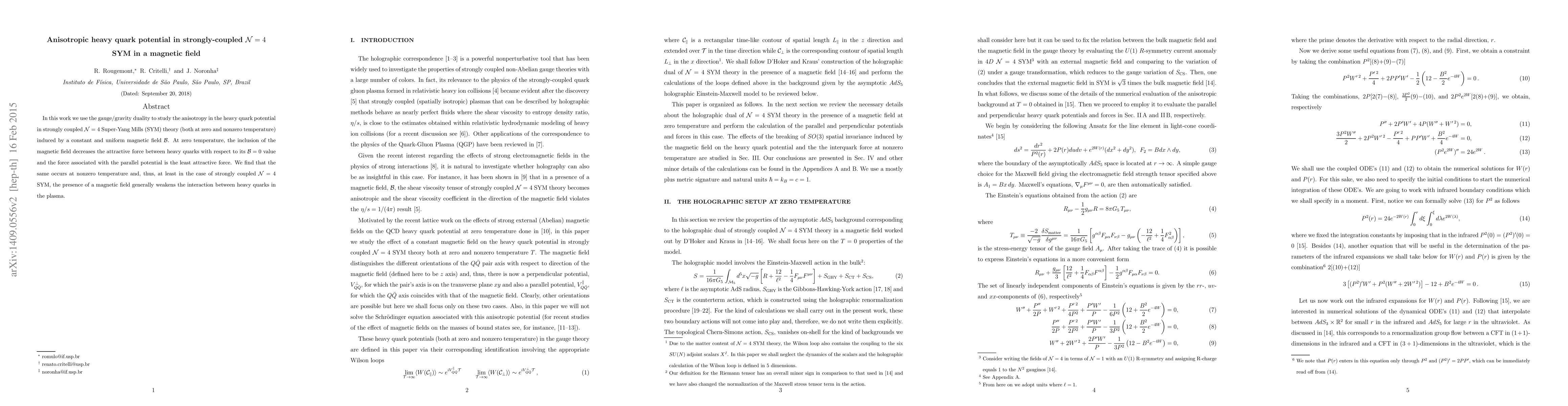 In this work we use the gauge/gravity duality to study the anisotropy in the heavy quark potential in strongly coupled $\mathcal{N}=4$ Super-Yang Mills (SYM) theory (both at zero and nonzero temperature) induced by a constant and uniform magnetic field $\mathcal{B}$. At zero temperature, the inclusion of the magnetic field decreases the attractive force between heavy quarks with respect to its $\mathcal{B}=0$ value and the force associated with the parallel potential is the least attractive force. We find that the same occurs at nonzero temperature and, thus, at least in the case of strongly coupled $\mathcal{N}=4$ SYM, the presence of a magnetic field generally weakens the interaction between heavy quarks in the plasma.