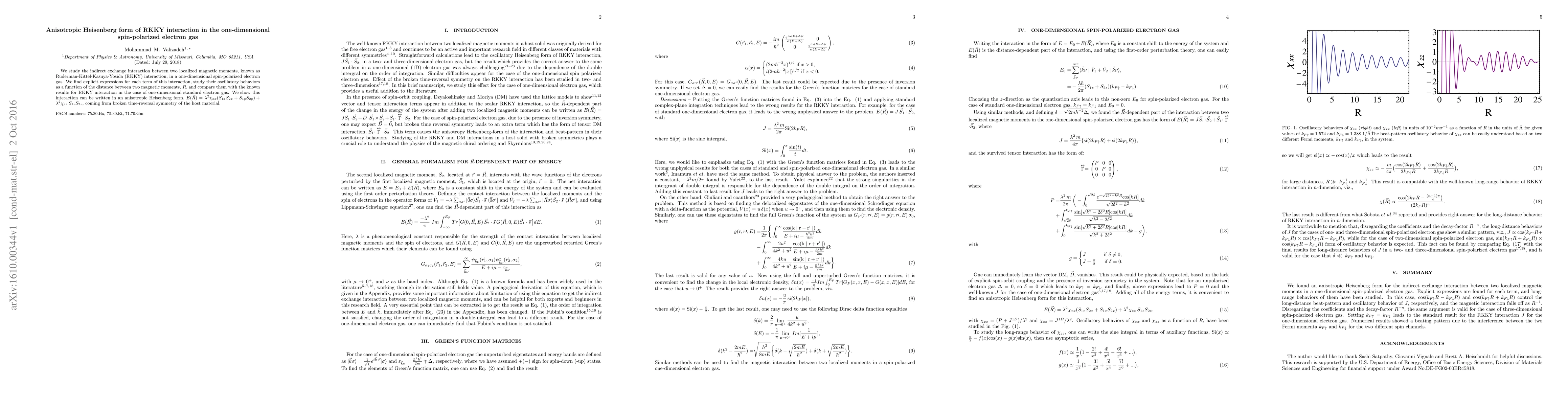 This paper investigates the anisotropic Heisenberg form of the RKKY interaction in a one-dimensional spin-polarized electron gas, deriving explicit expressions for the interaction's terms and their oscillatory behavior with distance. The study reveals that the interaction can be expressed in an anisotropic Heisenberg form due to the broken time-reversal symmetry in the material.