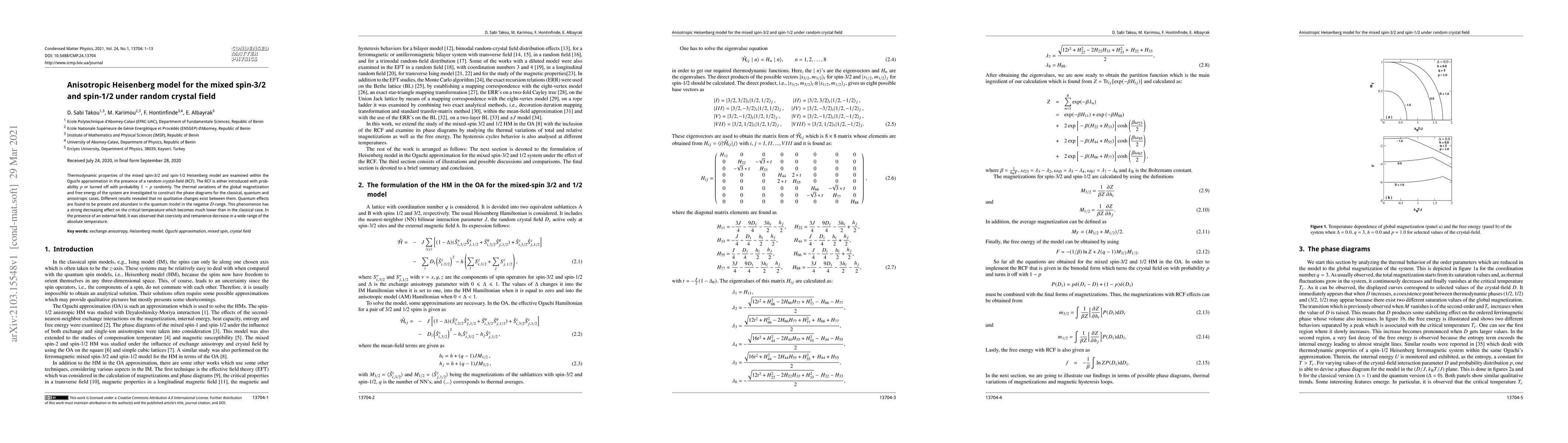 Researchers studied a mixed spin-3/2 and spin-1/2 Heisenberg model with random crystal field effects, finding that quantum effects significantly lower the critical temperature in the negative D-range, while external fields decrease coercivity and remanence.