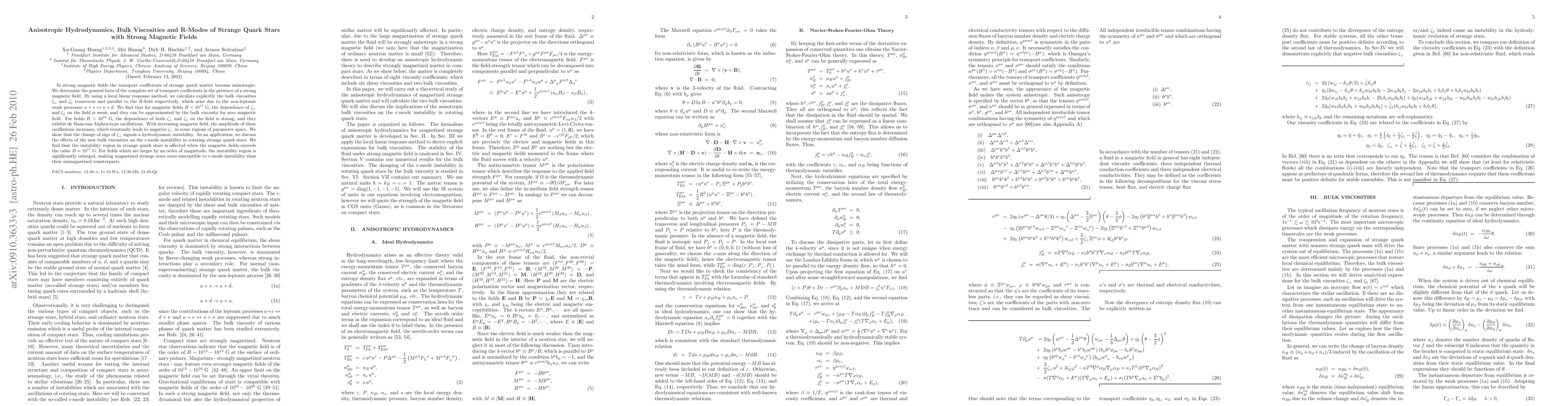 In strong magnetic fields the transport coefficients of strange quark matter become anisotropic. We determine the general form of the complete set of transport coefficients in the presence of a strong magnetic field. By using a local linear response method, we calculate explicitly the bulk viscosities $\zperp$ and $\zpara$ transverse and parallel to the $B$-field respectively, which arise due to the non-leptonic weak processes $u+s\leftrightarrow u+d$. We find that for magnetic fields $B<10^{17}$ G, the dependence of $\zperp$ and $\zpara$ on the field is weak, and they can be approximated by the bulk viscosity for zero magnetic field. For fields $B>10^{18}$ G, the dependence of both $\zperp$ and $\zpara$ on the field is strong, and they exhibit de Haas-van Alphen-type oscillations. With increasing magnetic field, the amplitude of these oscillations increases, which eventually leads to negative $\zperp$ in some regions of parameter space. We show that the change of sign of $\zperp$ signals a hydrodynamic instability. As an application, we discuss the effects of the new bulk viscosities on the r-mode instability in rotating strange quark stars. We find that the instability region in strange quark stars is affected when the magnetic fields exceeds the value $B= 10^{17}$ G. For fields which are larger by an order of magnitude, the instability region is significantly enlarged, making magnetized strange stars more susceptible to $r$-mode instability than their unmagnetized counterparts.