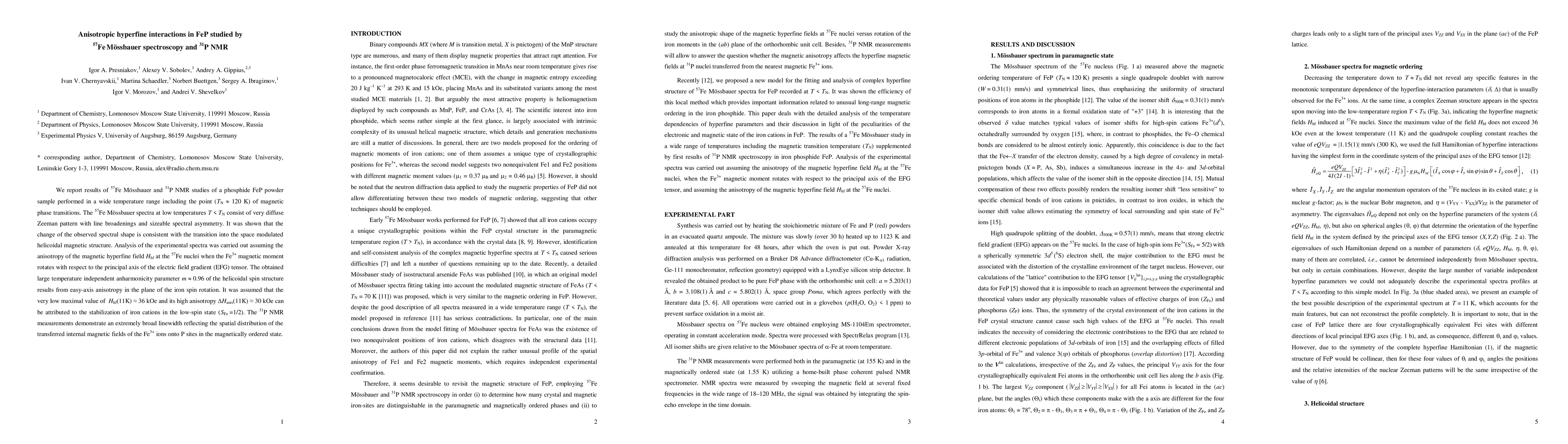 This study uses 57Fe Mössbauer spectroscopy and 31P NMR to investigate FeP's magnetic phase transitions around 120 K. The Mössbauer spectra reveal a transition into a space-modulated helicoidal magnetic structure, characterized by large anisotropy and low magnetic hyperfine field, suggesting stabilization of low-spin Fe3+ ions. The 31P NMR shows broad linewidths due to spatial magnetic field distribution from Fe3+ ions.
