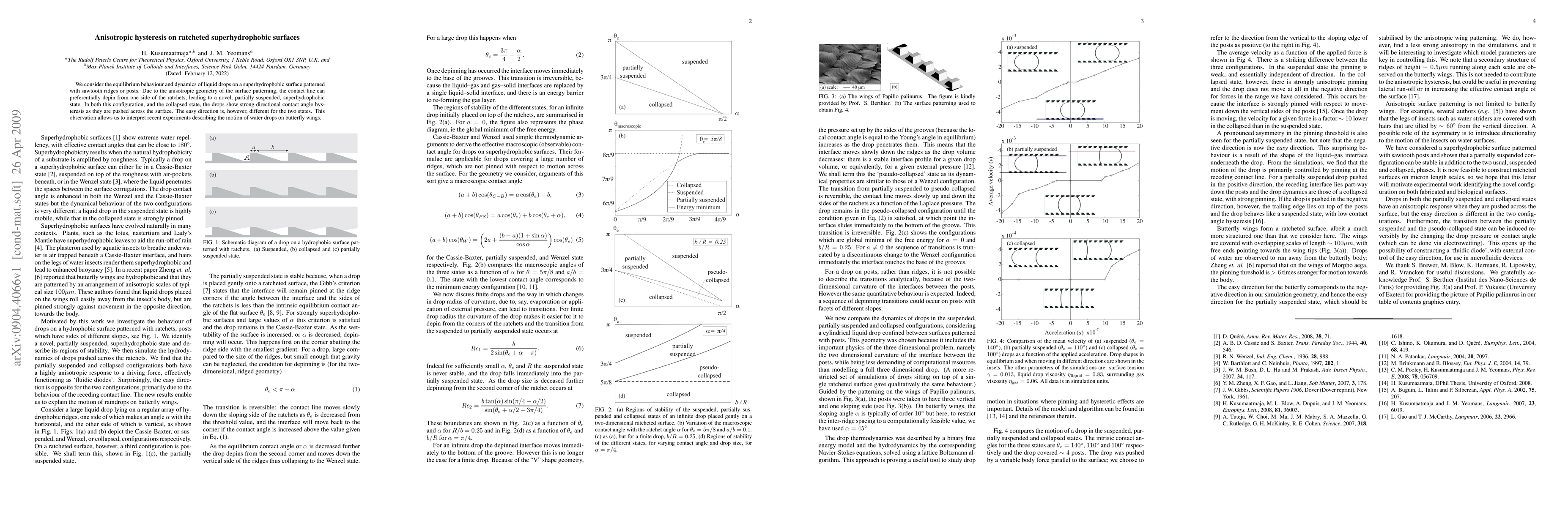 This study investigates the anisotropic hysteresis behavior of liquid drops on superhydrophobic surfaces with sawtooth ridges, revealing distinct directional contact angle hysteresis depending on whether the drops are in a partially suspended or collapsed state due to the surface's geometry. The findings correlate with observations of water drop motion on butterfly wings.