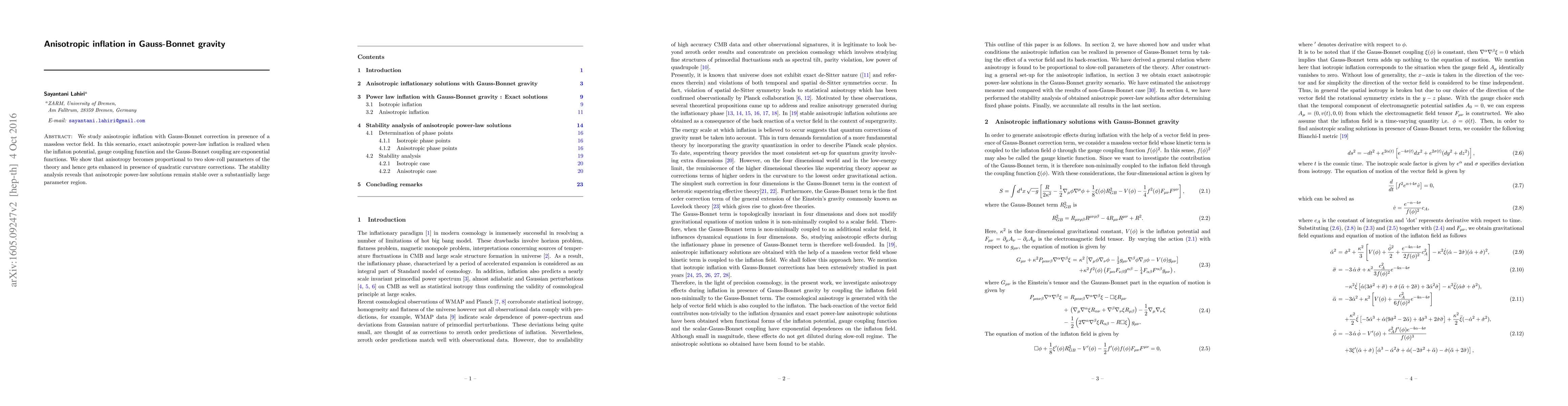 This paper explores anisotropic inflation driven by Gauss-Bonnet gravity with a massless vector field, demonstrating exact anisotropic power-law inflation through exponential inflaton potential, gauge coupling, and Gauss-Bonnet coupling functions. Stability analysis confirms the robustness of these solutions across a broad parameter range.