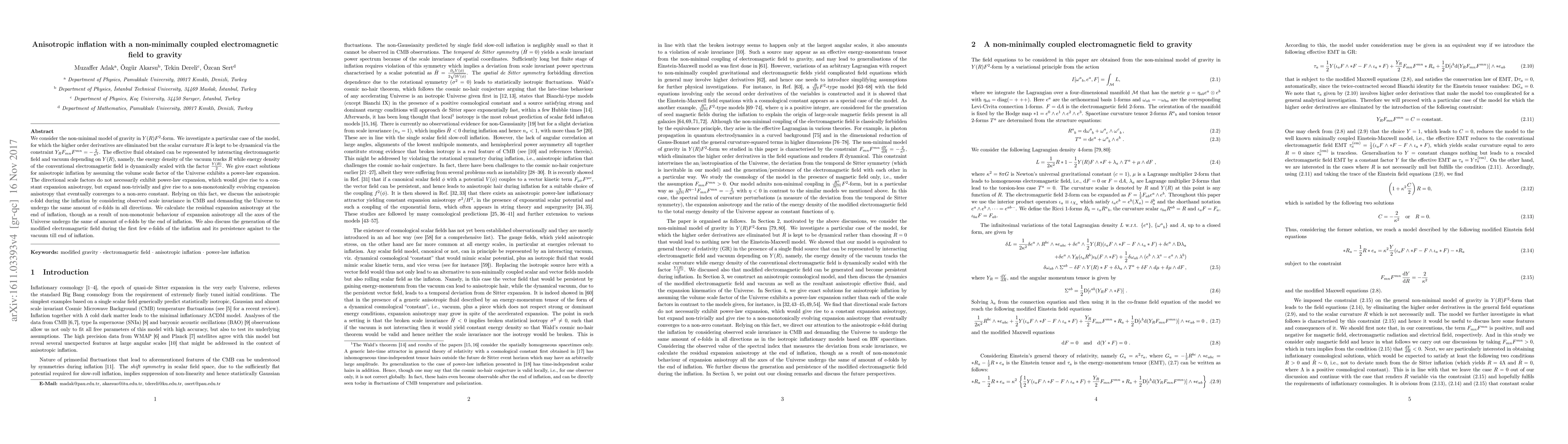 Researchers explore a model of gravity that includes an electromagnetic field, finding solutions for anisotropic inflation where the expansion rate varies in different directions, and the electromagnetic field is dynamically scaled with the universe's scale factor.