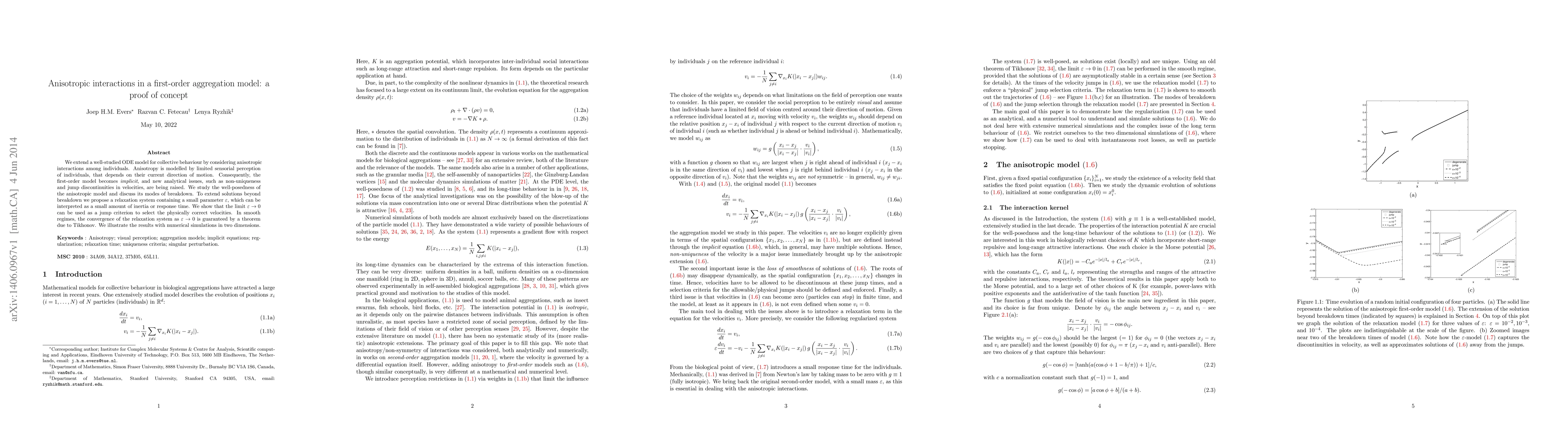 Researchers extended a collective behavior model to include anisotropic interactions, which affect individual perception based on direction of motion, leading to new analytical challenges and the development of a relaxation system with a small parameter to address these issues.