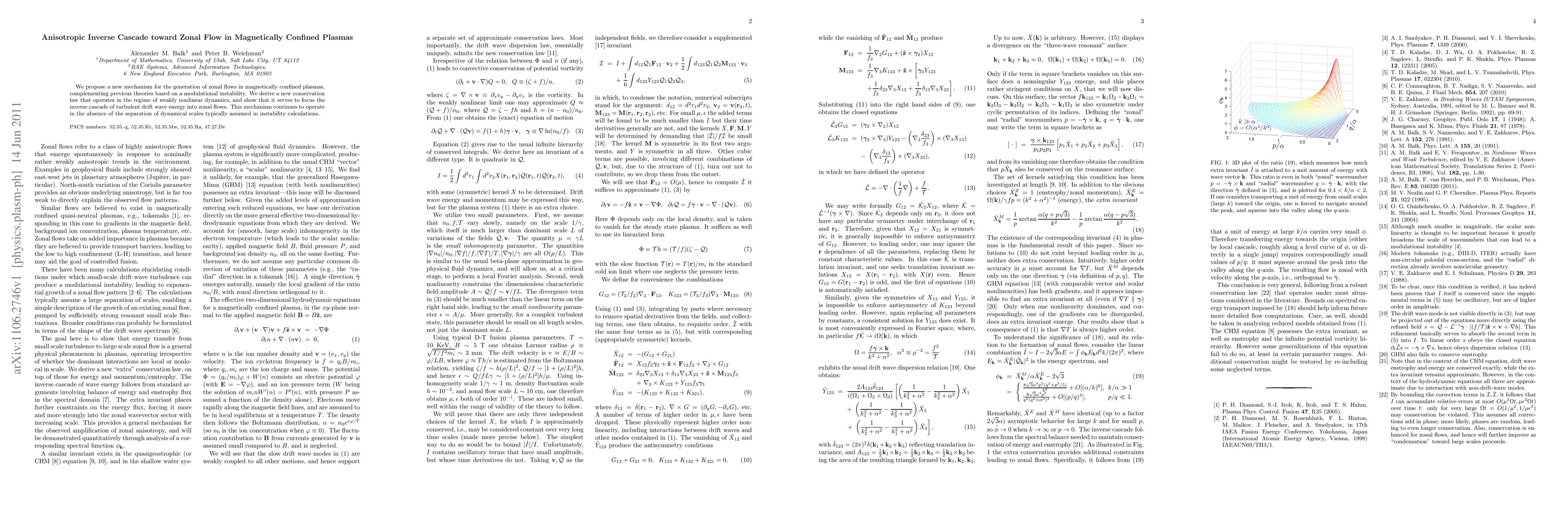 Summary: This paper proposes a novel mechanism for generating zonal flows in magnetically confined plasmas, based on an anisotropic inverse cascade. It introduces a new conservation law that directs turbulent drift wave energy into zonal flows, operating even without the usual separation of dynamical scales.