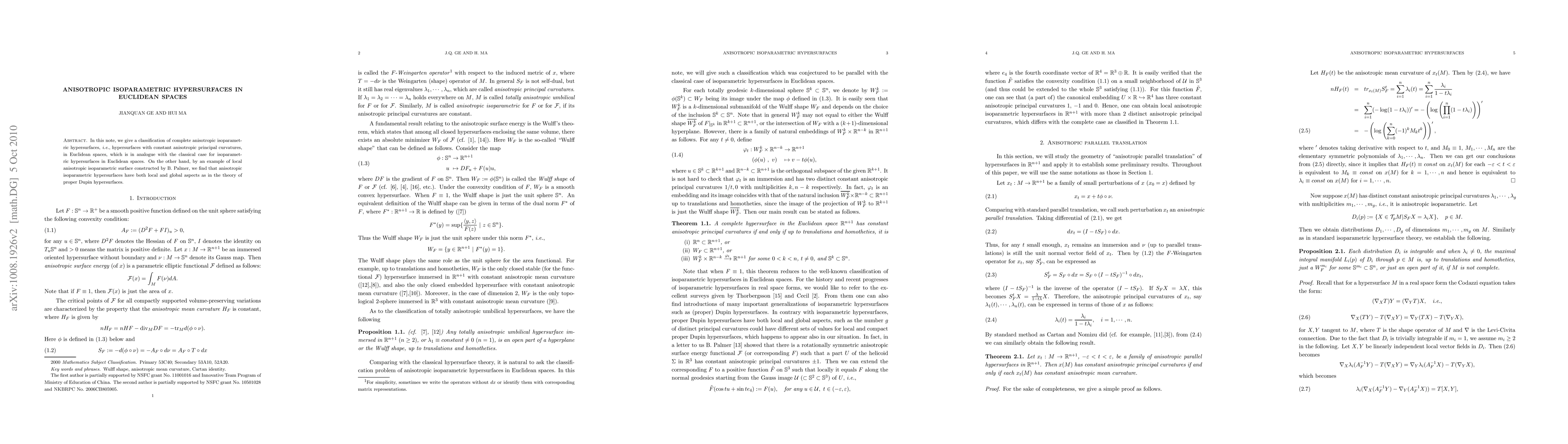 This paper classifies complete anisotropic isoparametric hypersurfaces in Euclidean spaces, drawing parallels to the classical isoparametric hypersurfaces. It also explores the local and global characteristics of these hypersurfaces, inspired by an example from B. Palmer.