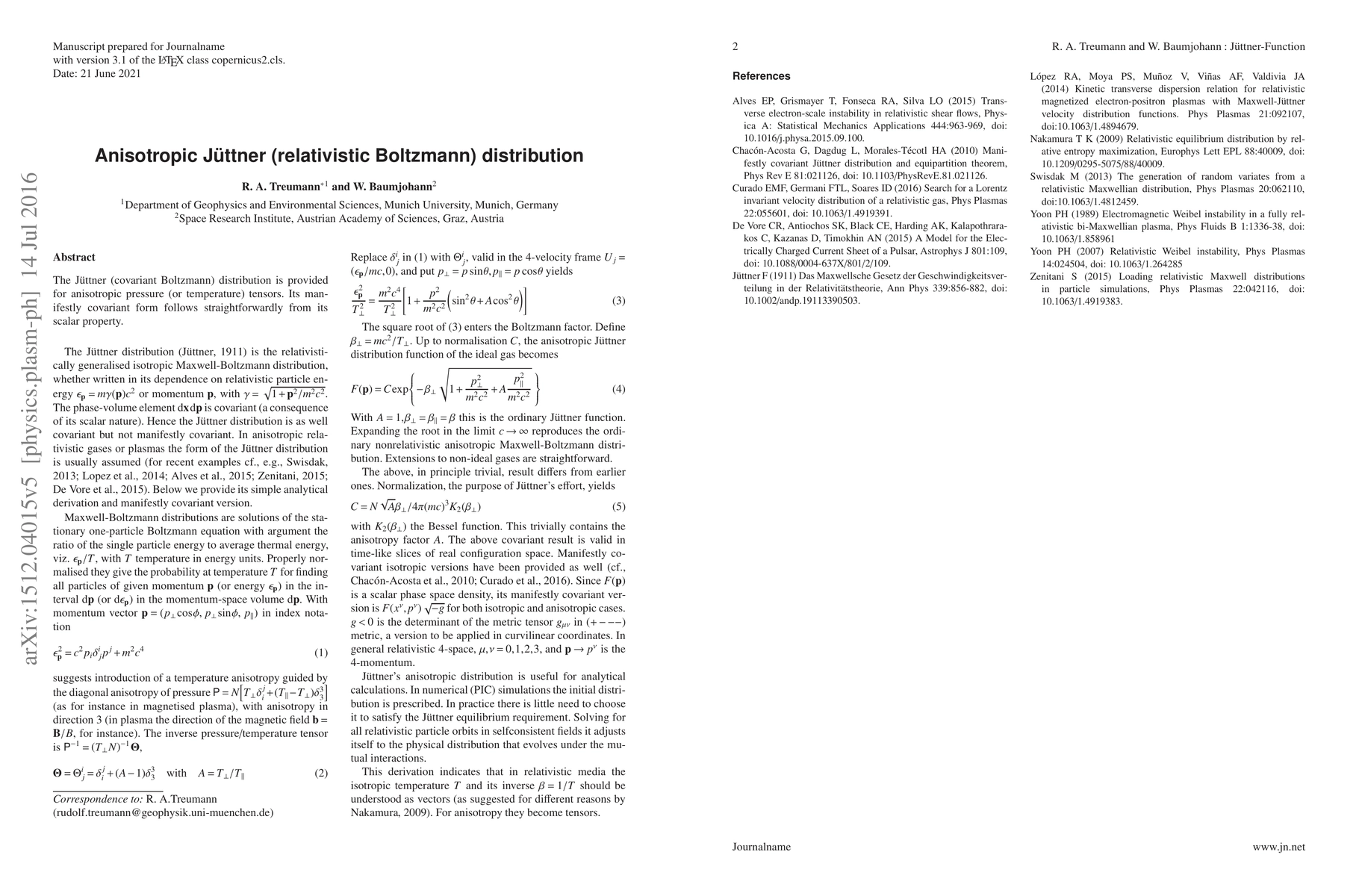 Summary: This paper presents the J\"uttner distribution for relativistic systems with anisotropic pressure or temperature, maintaining covariance through its scalar nature. The distribution's formulation accommodates non-isotropic pressure tensors.