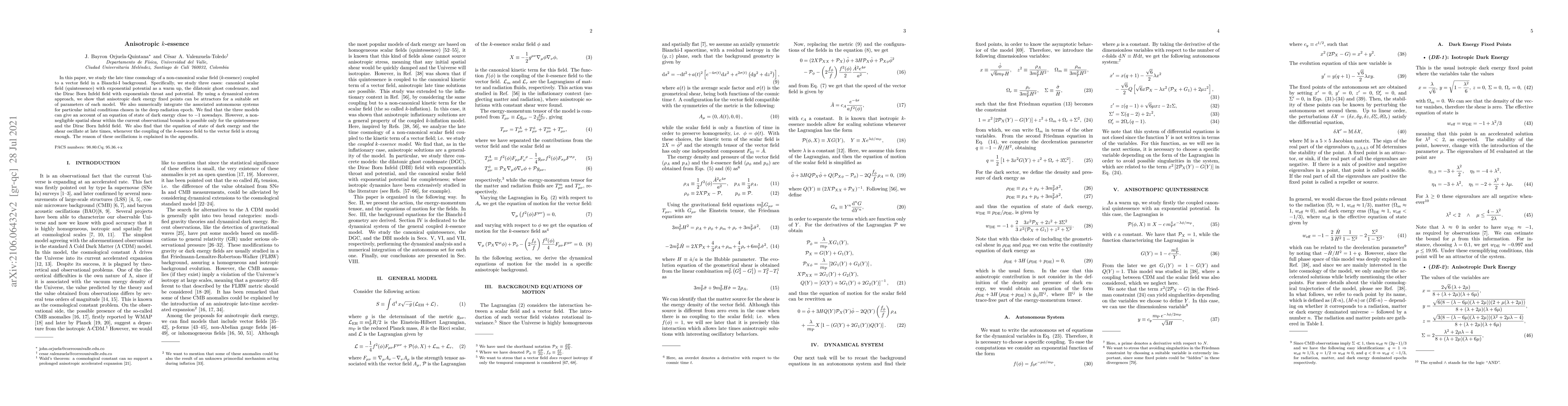 The paper presents a detailed dynamical system analysis of k-essence models coupled to vector fields, identifying anisotropic dark energy fixed points and their attractor nature under specific parameter conditions.