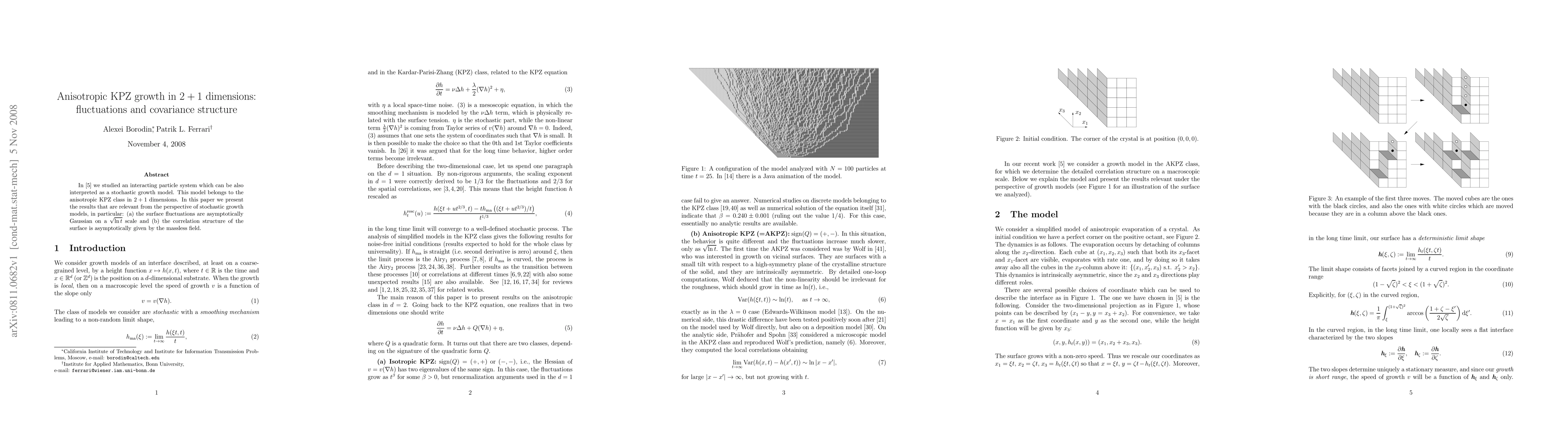 In [arXiv:0804.3035] we studied an interacting particle system which can be also interpreted as a stochastic growth model. This model belongs to the anisotropic KPZ class in 2+1 dimensions. In this paper we present the results that are relevant from the perspective of stochastic growth models, in particular: (a) the surface fluctuations are asymptotically Gaussian on a sqrt(ln(t)) scale and (b) the correlation structure of the surface is asymptotically given by the massless field.
