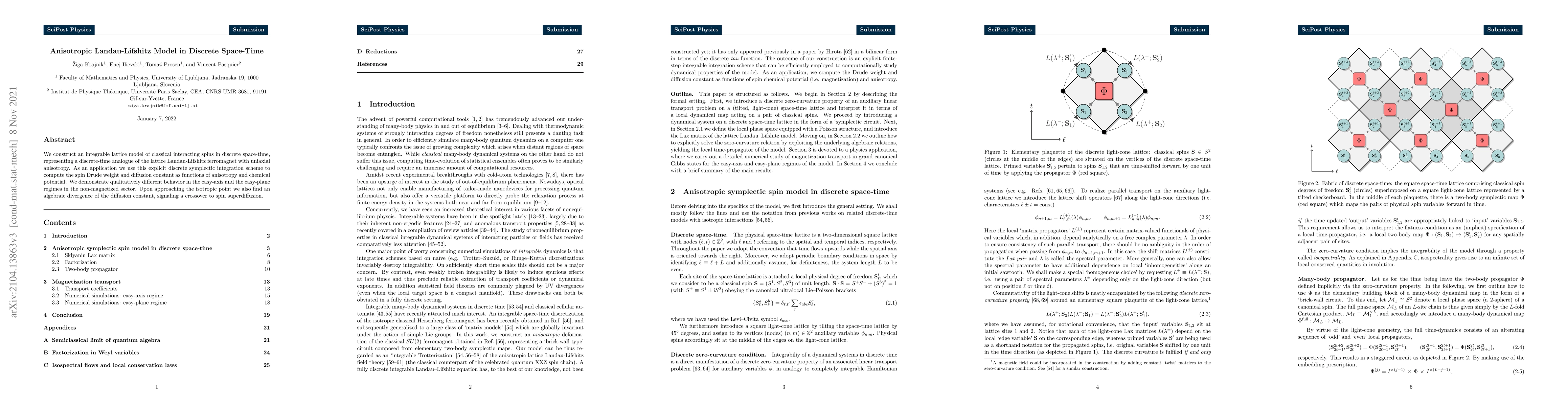 We construct an integrable lattice model of classical interacting spins in discrete space-time, representing a discrete-time analogue of the lattice Landau-Lifshitz ferromagnet with uniaxial anisotropy. As an application we use this explicit discrete symplectic integration scheme to compute the spin Drude weight and diffusion constant as functions of anisotropy and chemical potential. We demonstrate qualitatively different behavior in the easy-axis and the easy-plane regimes in the non-magnetized sector. Upon approaching the isotropic point we also find an algebraic divergence of the diffusion constant, signaling a crossover to spin superdiffusion.