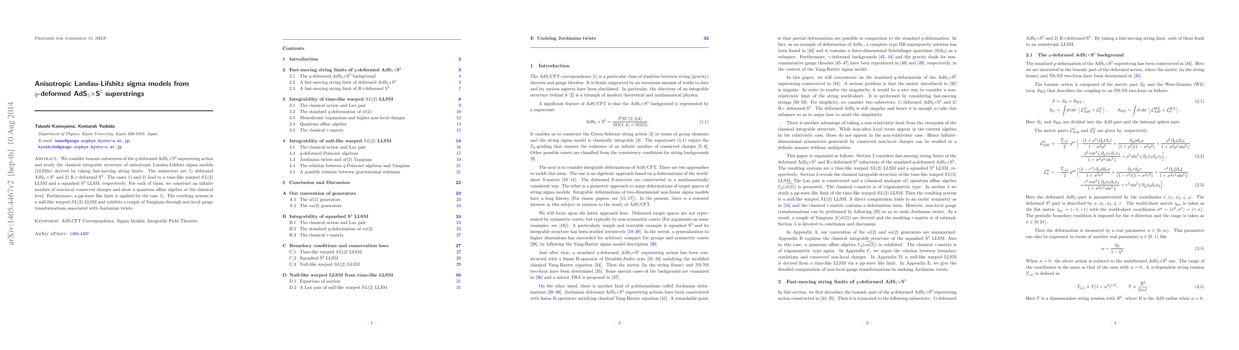 We consider bosonic subsectors of the q-deformed AdS_5 x S^5 superstring action and study the classical integrable structure of anisotropic Landau-Lifshitz sigma models (LLSMs) derived by taking fast-moving limits. The subsectors are 1) deformed AdS_3 x S^1 and 2) R x deformed S^3. The cases 1) and 2) lead to a time-like warped SL(2) LLSM and a squashed S^3 LLSM, respectively. For each of them, we construct an infinite number of non-local conserved charges and show a quantum affine algebra at the classical level. Furthermore, a pp-wave like limit is applied for the case 1). The resulting system is a null-like warped SL(2) LLSM and exhibits a couple of Yangians through non-local gauge transformations associated with Jordanian twists.