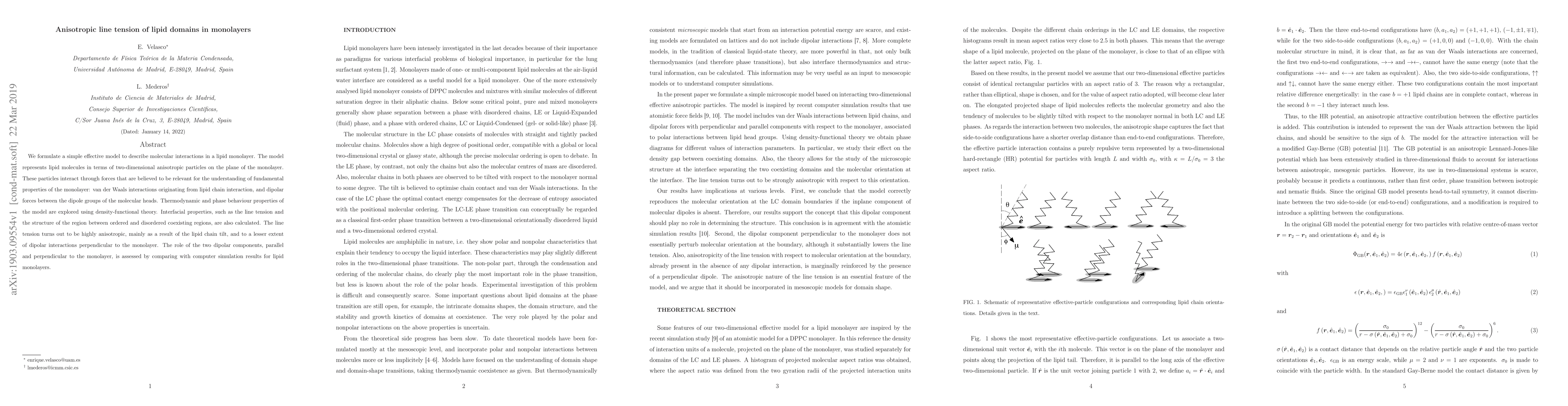 This paper develops an effective model to describe lipid interactions in monolayers, revealing anisotropic line tension due to lipid chain tilt and dipolar forces. Density-functional theory is used to explore thermodynamic and phase behavior, with results compared to simulation data.