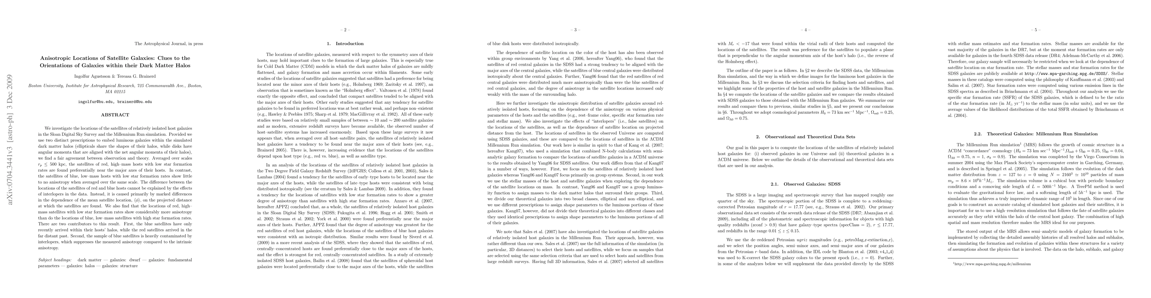We investigate the locations of the satellites of relatively isolated host galaxies in the Sloan Digital Sky Survey and the Millennium Run simulation. Provided we use two distinct prescriptions to embed luminous galaxies within the simulated dark matter halos (ellipticals share the shapes of their halos, while disks have angular momenta that are aligned with the net angular momenta of their halos), we find a fair agreement between observation and theory. Averaged over scales r_p \le 500 kpc, the satellites of red, high-mass hosts with low star formation rates are found preferentially near the major axes of their hosts. In contrast, the satellites of blue, low-mass hosts with low star formation rates show little to no anisotropy when averaged over the same scale. The difference between the locations of the satellites of red and blue hosts cannot be explained by the effects of interlopers in the data. Instead, it is caused primarily by marked differences in the dependence of the mean satellite location, <\phi>, on the projected distance at which the satellites are found. We also find that the locations of red, high-mass satellites with low star formation rates show considerably more anisotropy than do the locations of blue, low--mass satellites with high star formation rates. There are two contributors to this result. First, the blue satellites have only recently arrived within their hosts' halos, while the red satellites arrived in the far distant past. Second, the sample of blue satellites is heavily contaminated by interlopers, which suppresses the measured anisotropy compared to the intrinsic anisotropy.