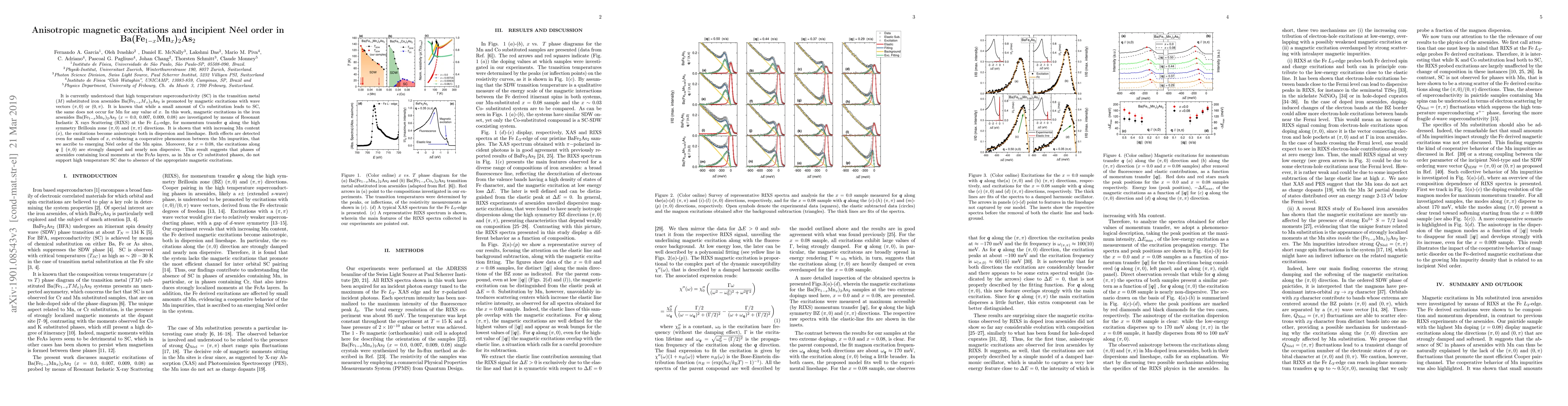 It is currently understood that high temperature superconductivity (SC) in the transition metal $(M)$ substituted iron arsenides Ba(Fe$_{1-x}$$M$$_{x}$)$_{2}$As$_{2}$ is promoted by magnetic excitations with wave vectors $(\pi,0)$ or $(0,\pi)$. It is known that while a small amount of Co substitution leads to SC, the same does not occur for Mn for any value of $x$. In this work, magnetic excitations in the iron arsenides Ba(Fe$_{1-x}$Mn$_{x}$)$_{2}$As$_{2}$ ($x=0.0$, $0.007$, $0.009$, $0.08$) are investigated by means of Resonant Inelastic X rays Scattering (RIXS) at the Fe $L_{3}$-edge, for momentum transfer $\boldsymbol{q}$ along the high symmetry Brillouin zone $(\pi,0)$ and $(\pi,\pi)$ directions. It is shown that with increasing Mn content ($x$), the excitations become anisotropic both in dispersion and lineshape. Both effects are detected even for small values of $x$, evidencing a cooperative phenomenon between the Mn impurities, that we ascribe to emerging N\'eel order of the Mn spins. Moreover, for $x=0.08$, the excitations along $\boldsymbol{q}\parallel(\pi,0)$ are strongly damped and nearly non dispersive. This result suggests that phases of arsenides containing local moments at the FeAs layers, as in Mn or Cr substituted phases, do not support high temperature SC due to absence of the appropriate magnetic excitations.