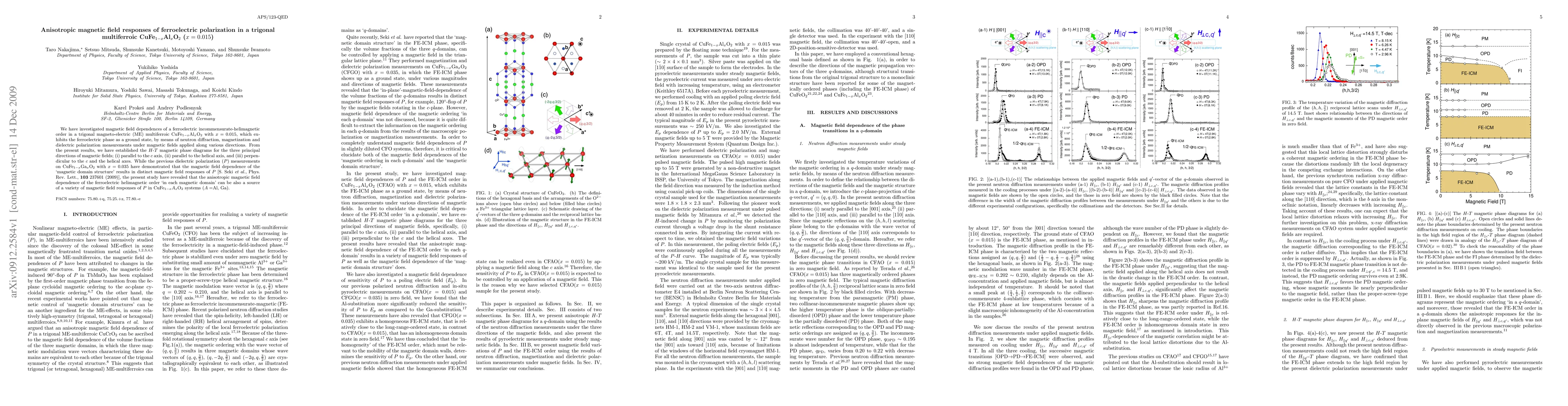 This study investigates the anisotropic magnetic field responses of ferroelectric polarization in the trigonal multiferroic CuFe1-xAlxO2 (x=0.015) using neutron diffraction, magnetization, and dielectric polarization measurements. The research establishes magnetic phase diagrams for different magnetic field orientations, revealing that the anisotropic magnetic field dependence of ferroelectric helimagnetic order influences the magnetic field responses of polarization.