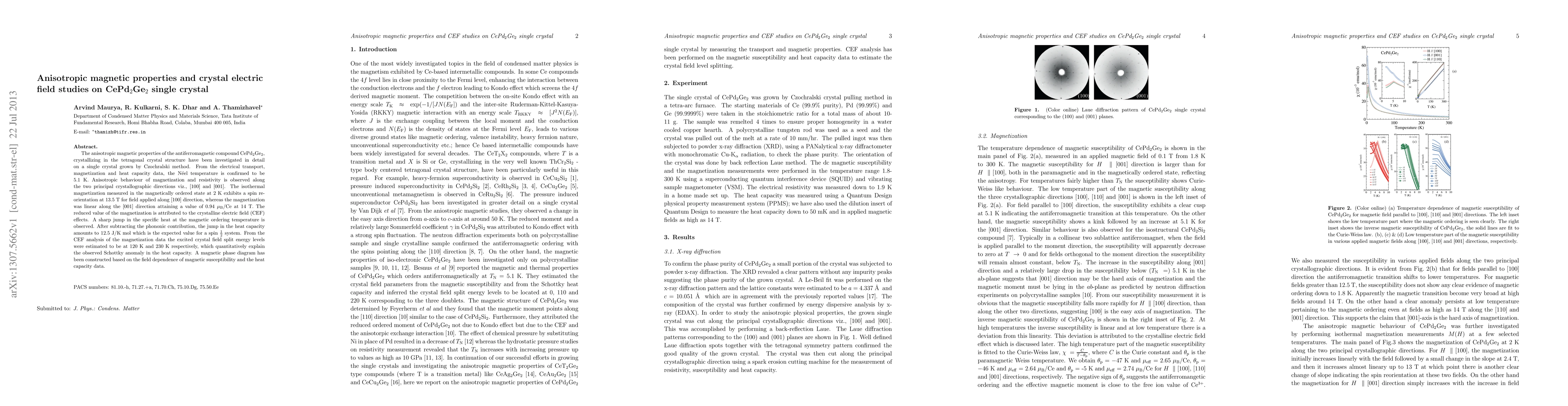This study investigates the anisotropic magnetic properties of the antiferromagnetic compound CePd$_2$Ge$_2$ in a single crystal, revealing a Néel temperature of 5.1 K and spin re-orientation at 13.5 T along the [100] direction. The reduced magnetization is attributed to crystalline electric field effects, with energy levels at 120 K and 230 K explaining the observed Schottky anomaly.
