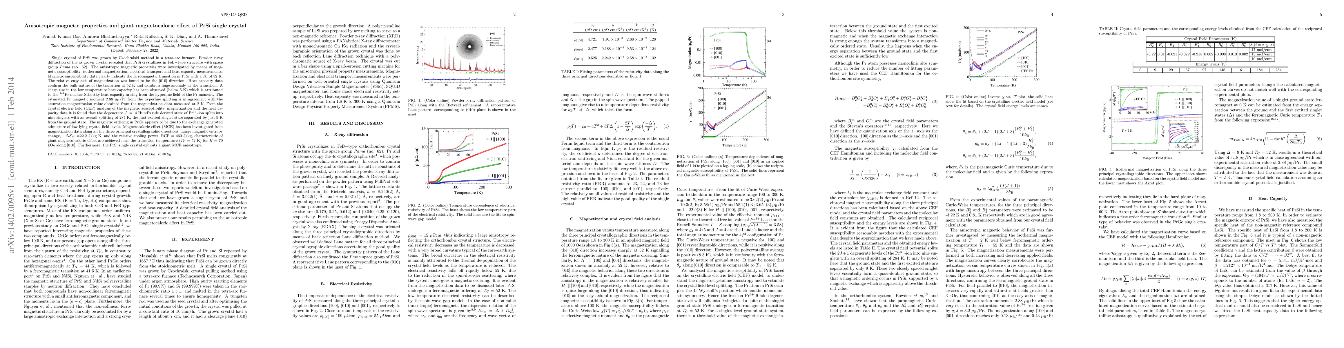 Single crystal of PrSi was grown by Czochralski method in a tetra-arc furnace. Powder x-ray diffraction of the as grown crystal revealed that PrSi crystallizes in FeB$-$type structure with space group $Pnma$ (no. 62). PrSi undergoes a ferromagnetic transition at 52 K with [010] direction as the easy axis of magnetization. Heat capacity data confirm the bulk nature of the transition at 52 K and exhibit a huge anomaly at the transition. A sharp rise in the low temperature heat capacity has been observed (below 5 K) which is attributed to the $^{141}$Pr nuclear Schottky heat capacity arising from the hyperfine field of the Pr moment. The estimated Pr magnetic moment 2.88 $\mu_{\rm B}$/Pr from the hyperfine splitting is in agreement with the saturation magnetization value obtained from the magnetization data measured at 2 K. From the crystal electric field (CEF) analysis of the magnetic susceptibility, magnetization and the heat capacity data it is found that the degenerate $J = 4$ Hund's rule derived state of Pr$^{3+}$-ion splits into nine singlets with an overall splitting of 284 K, the first excited singlet state separated by just 9 K from the ground state. The magnetic ordering in PrGe appears to be due to the exchange generated admixture of low lying crystal field levels. Magnetocaloric effect (MCE) has been investigated from magnetization data along all the three principal crystallographic directions. Large magnetic entropy change, $-\Delta S_M = $22.2 J/kg K, and the relative cooling power, RCP = $460$ J/kg, characteristic of giant magneto caloric effect are achieved near the transition temperature ($T_{\rm C}$ = 52 K) for $H =$~70 kOe along $[010]$. Furthermore, the PrSi single crystal exhibits a giant MCE anisotropy.
