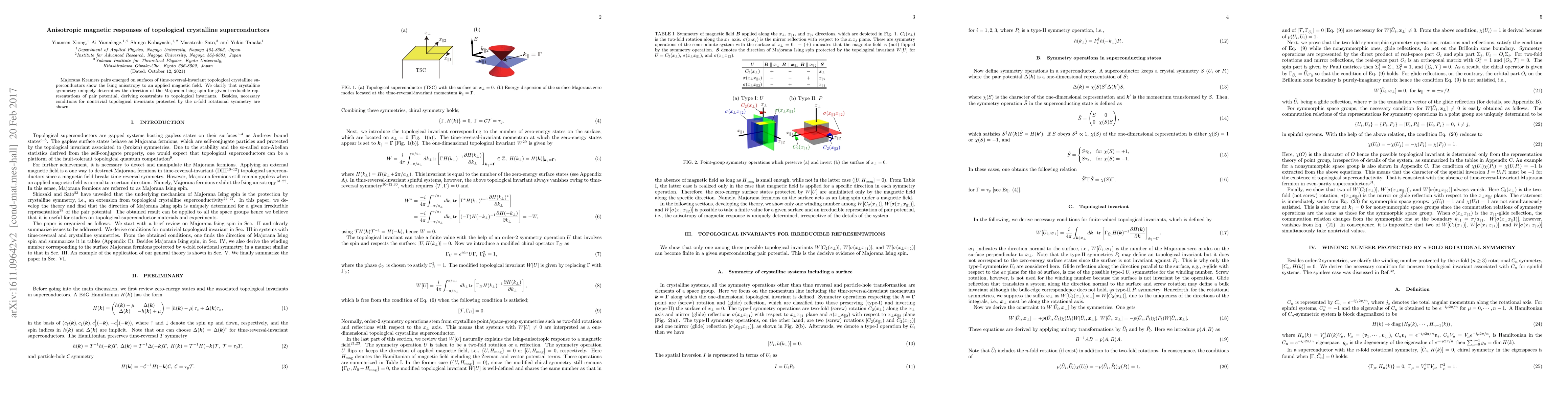 This paper investigates the anisotropic magnetic responses of topological crystalline superconductors, revealing that the crystalline symmetry dictates the direction of Majorana Ising spin under an applied magnetic field. It also establishes constraints on topological invariants and conditions for nontrivial invariants protected by n-fold rotational symmetry.