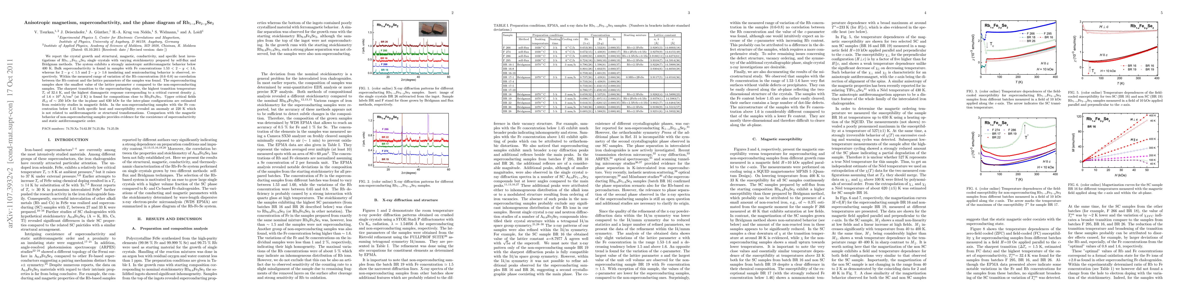 This paper investigates the anisotropic magnetism, superconductivity, and phase diagram of Rb(1-x)Fe(2-y)Se2 single crystals. The study finds superconductivity at optimal Fe concentrations near Rb2Fe4Se5, with a peak transition temperature of 32.4 K, while lower and higher Fe concentrations result in insulating and semiconducting behaviors, respectively.