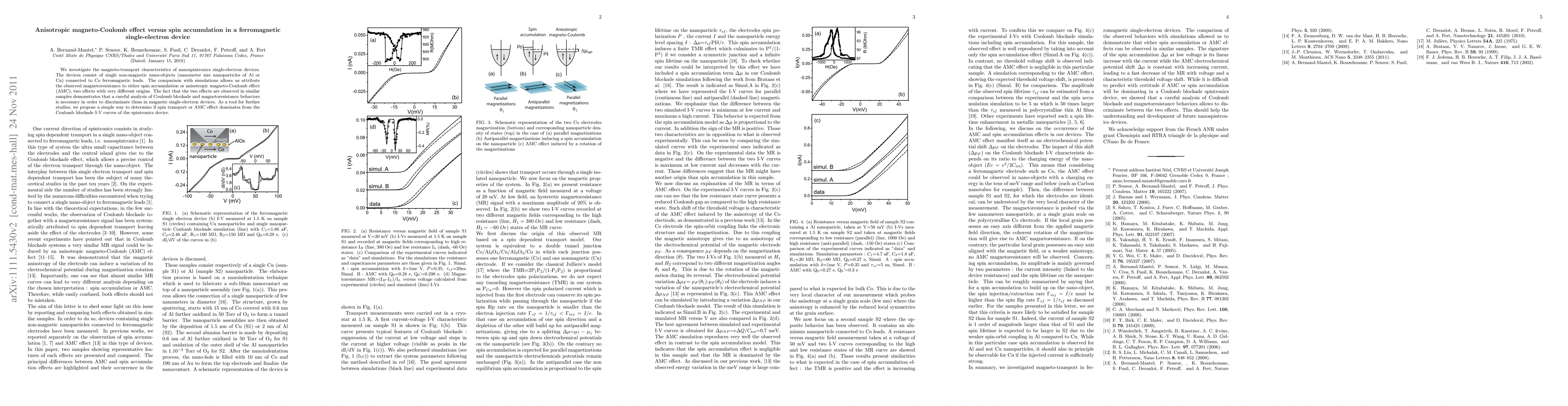 We investigate the magneto-transport characteristics of nanospintronics single-electron devices. The devices consist of single non-magnetic nano-objects (nanometer size nanoparticles of Al or Cu) connected to Co ferromagnetic leads. The comparison with simulations allows us attribute the observed magnetoresistance to either spin accumulation or anisotropic magneto-Coulomb effect (AMC), two effects with very different origins. The fact that the two effects are observed in similar samples demonstrates that a careful analysis of Coulomb blockade and magnetoresistance behaviors is necessary in order to discriminate them in magnetic single-electron devices. As a tool for further studies, we propose a simple way to determine if spin transport or AMC effect dominates from the Coulomb blockade I-V curves of the spintronics device.